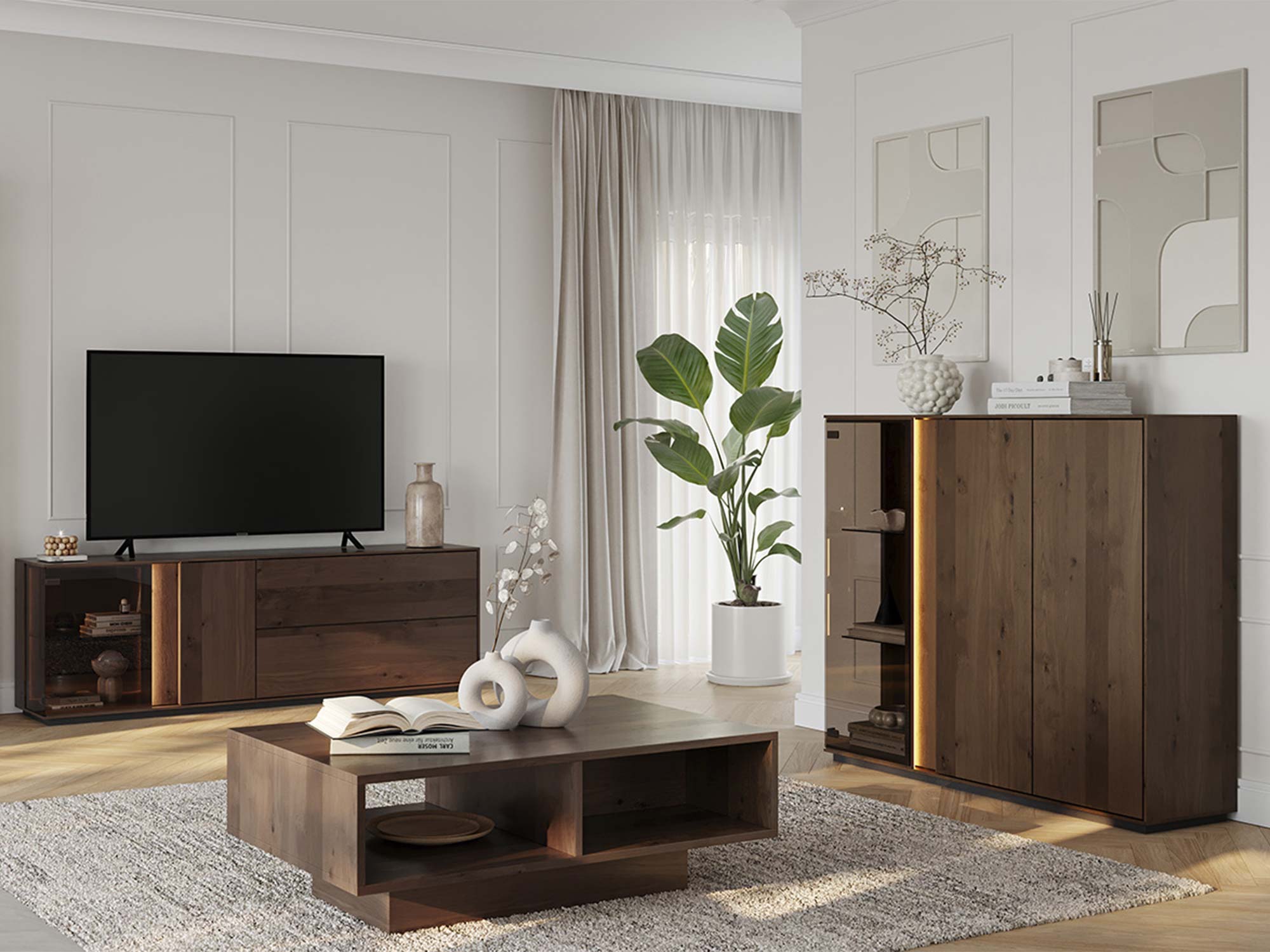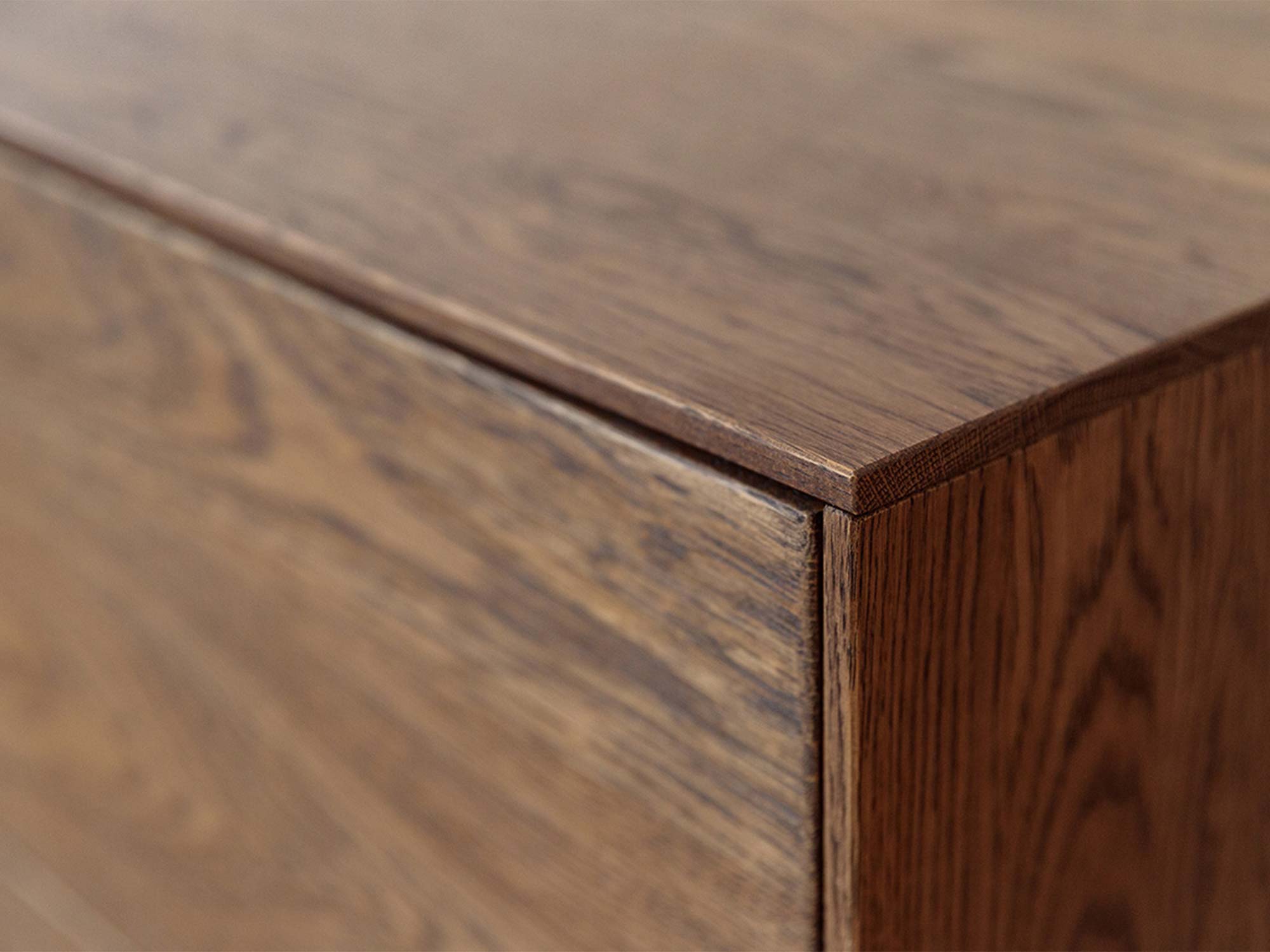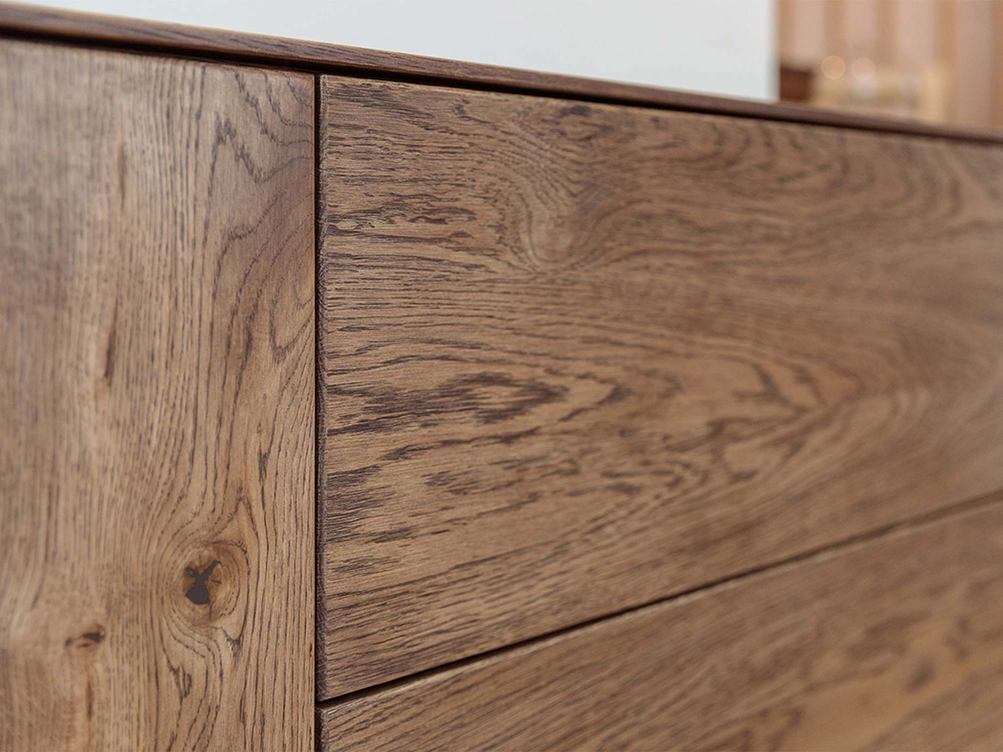 Wyjątkowy odcień tabacco i naturalne usłojenie dzikiego dębu nadają szafce niepowtarzalnego charakteru. Każdy egzemplarz jest unikatowy, ponieważ drewno nigdy nie powtarza swojego rysunku. Olejowana powierzchnia nie tylko podkreśla piękno drewna, ale także chroni je przed zarysowaniami i plamami. To właśnie ta kombinacja estetyki i ochrony sprawia, że szafka Essentia będzie zdobić Twój salon przez długie lata.