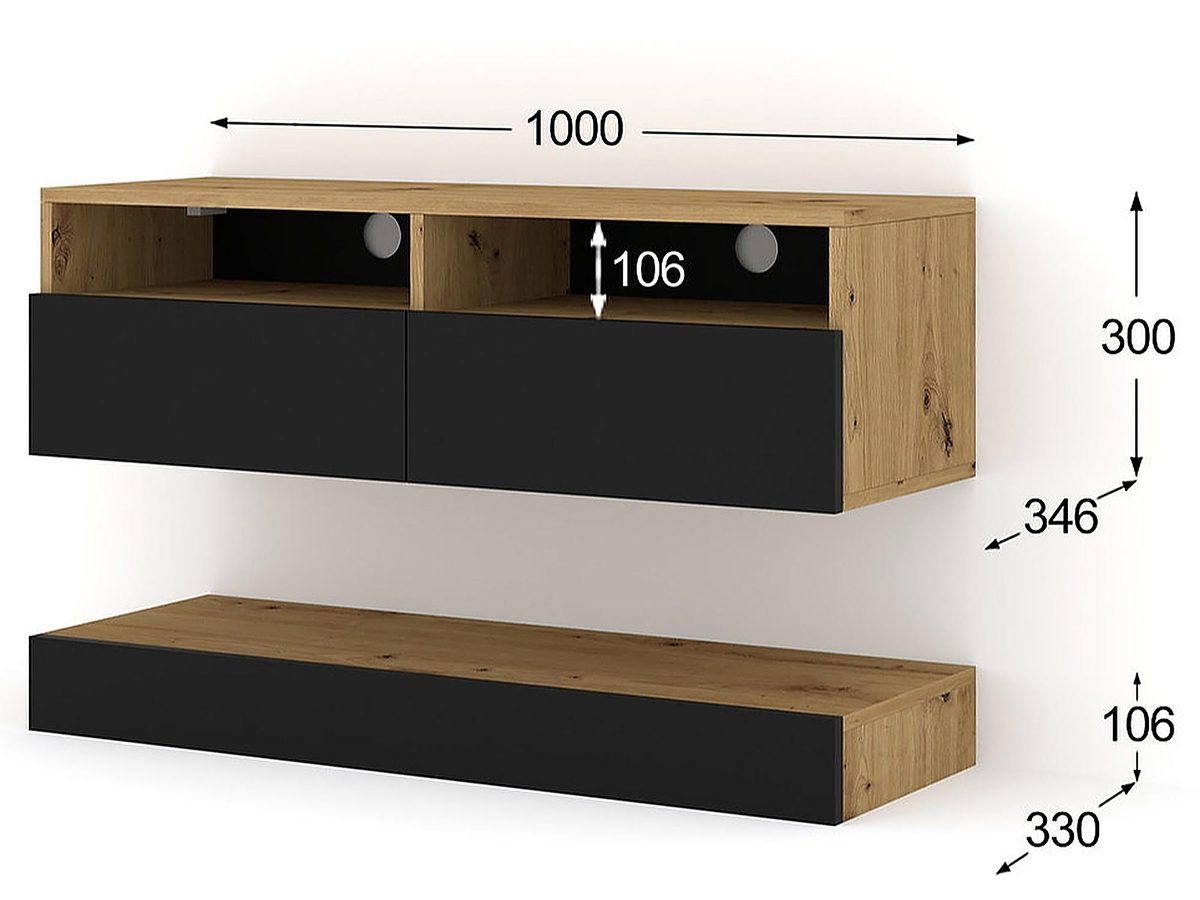 Zestaw szafek RTV do salonu, drewno dębowe i czarne akcenty z wymiarami technicznymi