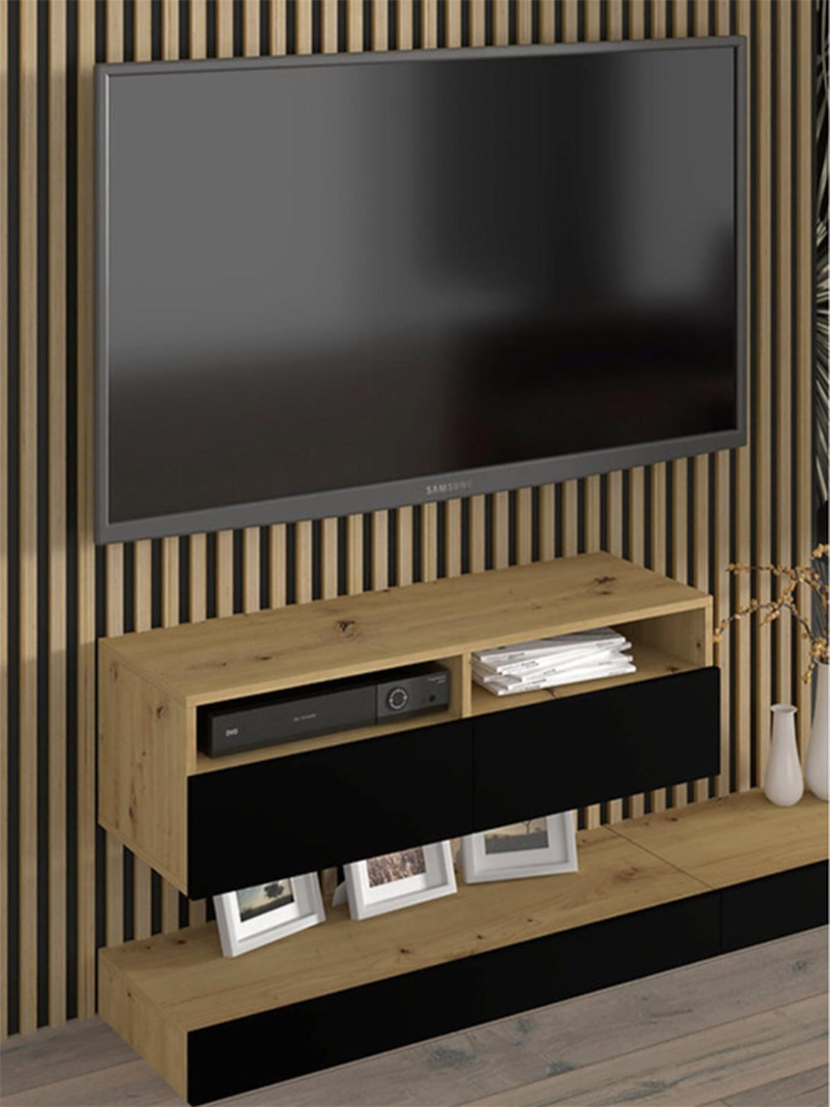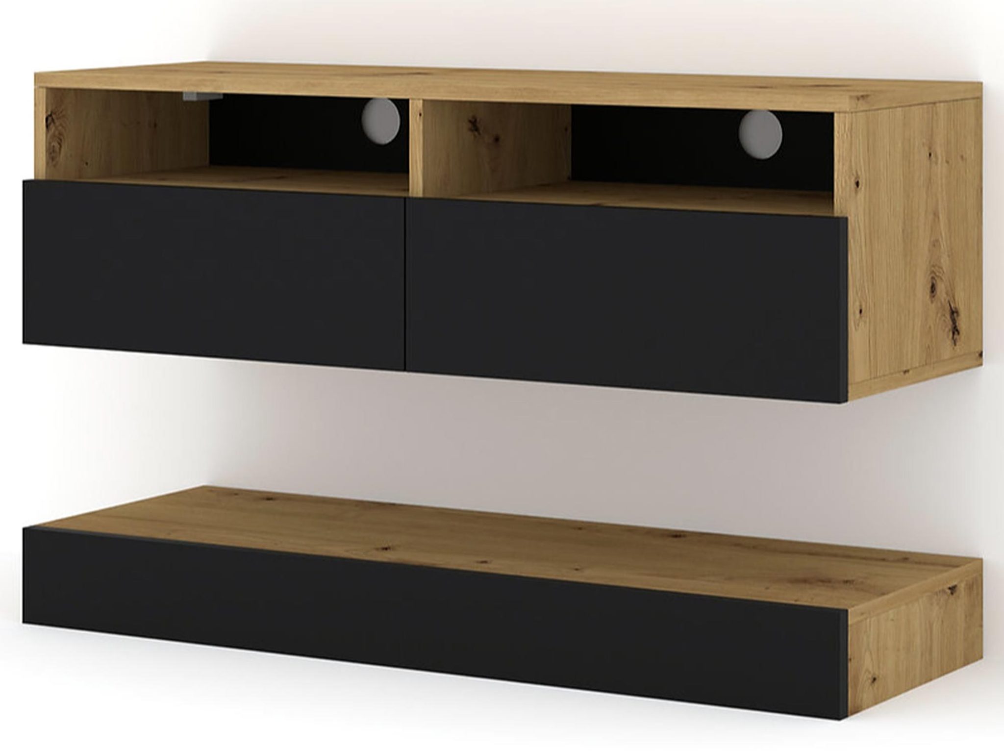 Szafka RTV Wisząca 100 cm Elsa wyróżnia się minimalistycznym, ale jednocześnie wyrafinowanym designem. Korpus w kolorze dąb artisan w połączeniu z matowymi czarnymi frontami tworzy harmonijną całość, która doskonale komponuje się z różnymi stylami wnętrz – od nowoczesnych po skandynawskie. Część wisząca z dwoma zamykanymi schowkami oraz dwiema otwartymi półkami zapewnia nie tylko estetykę, ale także praktyczne rozwiązania na co dzień.