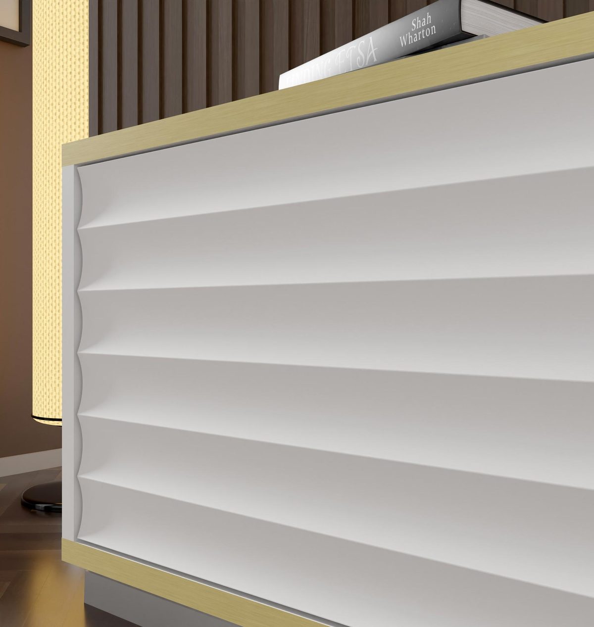 Szafka RTV Sereno wykonana jest z płyty laminowanej o grubości 16 mm, co zapewnia jej trwałość i odporność na uszkodzenia mechaniczne. Fronty z płyty MDF z dekoracyjnymi frezami dodają meblowi nowoczesnego charakteru. Złote akcenty w postaci poziomych linii harmonijnie współgrają z klasyczną kolorystyką, nadając szafce elegancki wygląd.