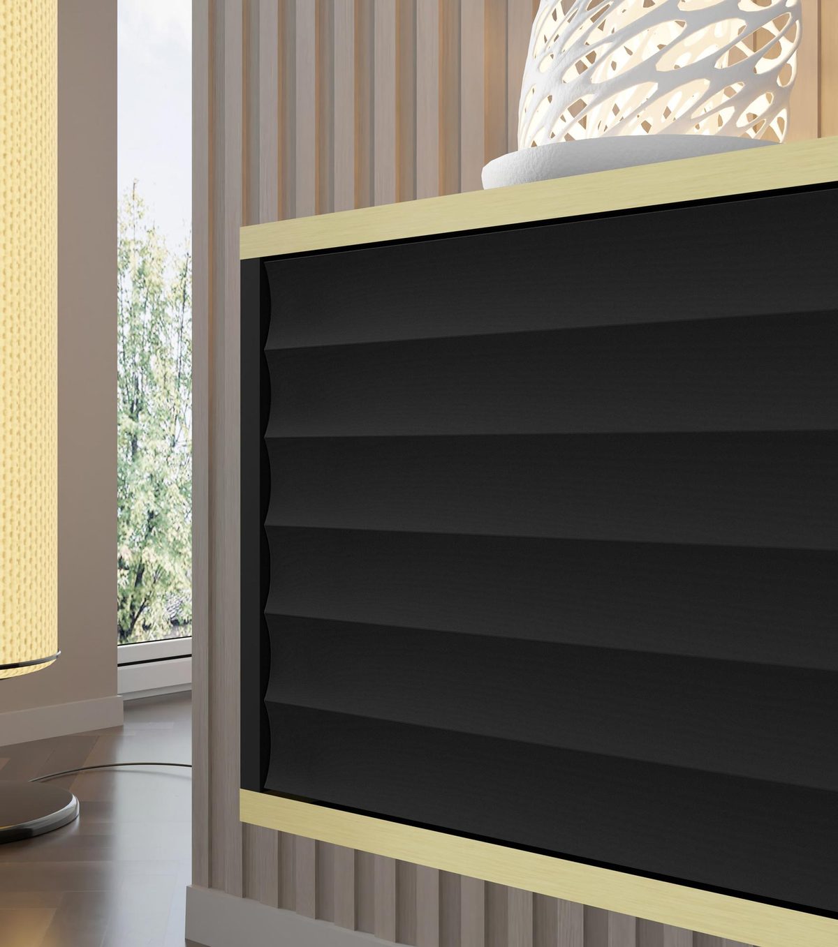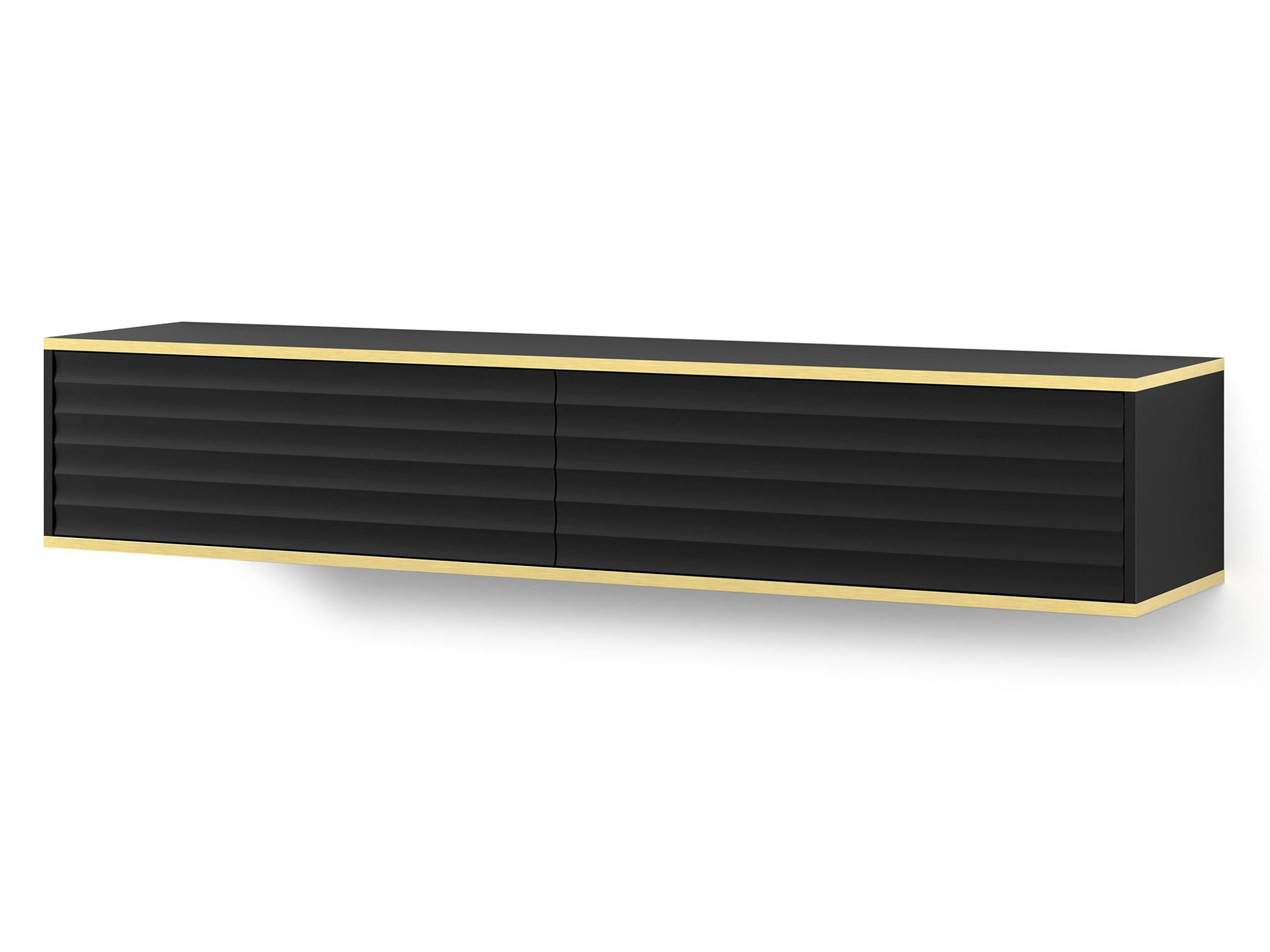 Luksusowa szafka RTV z czarnymi frontami i złotymi liniami kolor czarny i złoty
