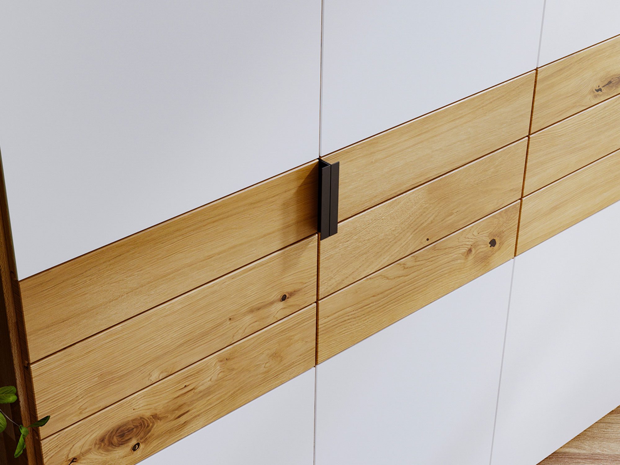 Wzrok przyciąga poziomy pas z litego drewna dębowego, który nadaje bryle harmonijnego rytmu i estetycznej lekkości. Dodatkowo subtelne, czarne uchwyty wprowadzają nowoczesny akcent, idealnie kontrastując z jasną kolorystyką frontów.