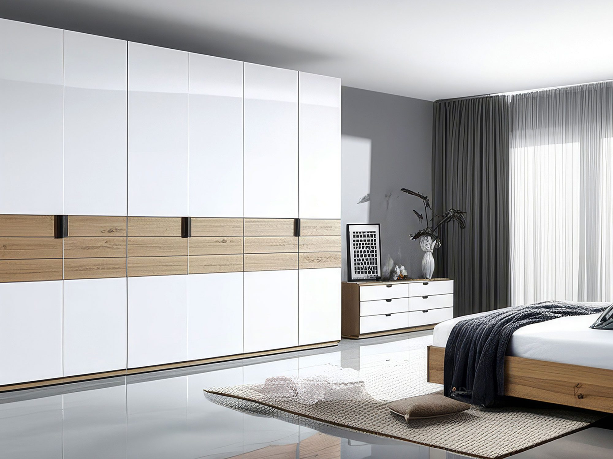 Fronty zostały ręcznie wykończone – na naturalne drewno naklejono tafle lakierowanego szkła satynowego w kolorze białym. To połączenie daje efekt lekkości, nowoczesności i subtelnego połysku, który wprowadza do wnętrza więcej światła. Dzięki temu szafa doskonale komponuje się z jasnymi aranżacjami, ale równie pięknie kontrastuje z ciemniejszymi ścianami.