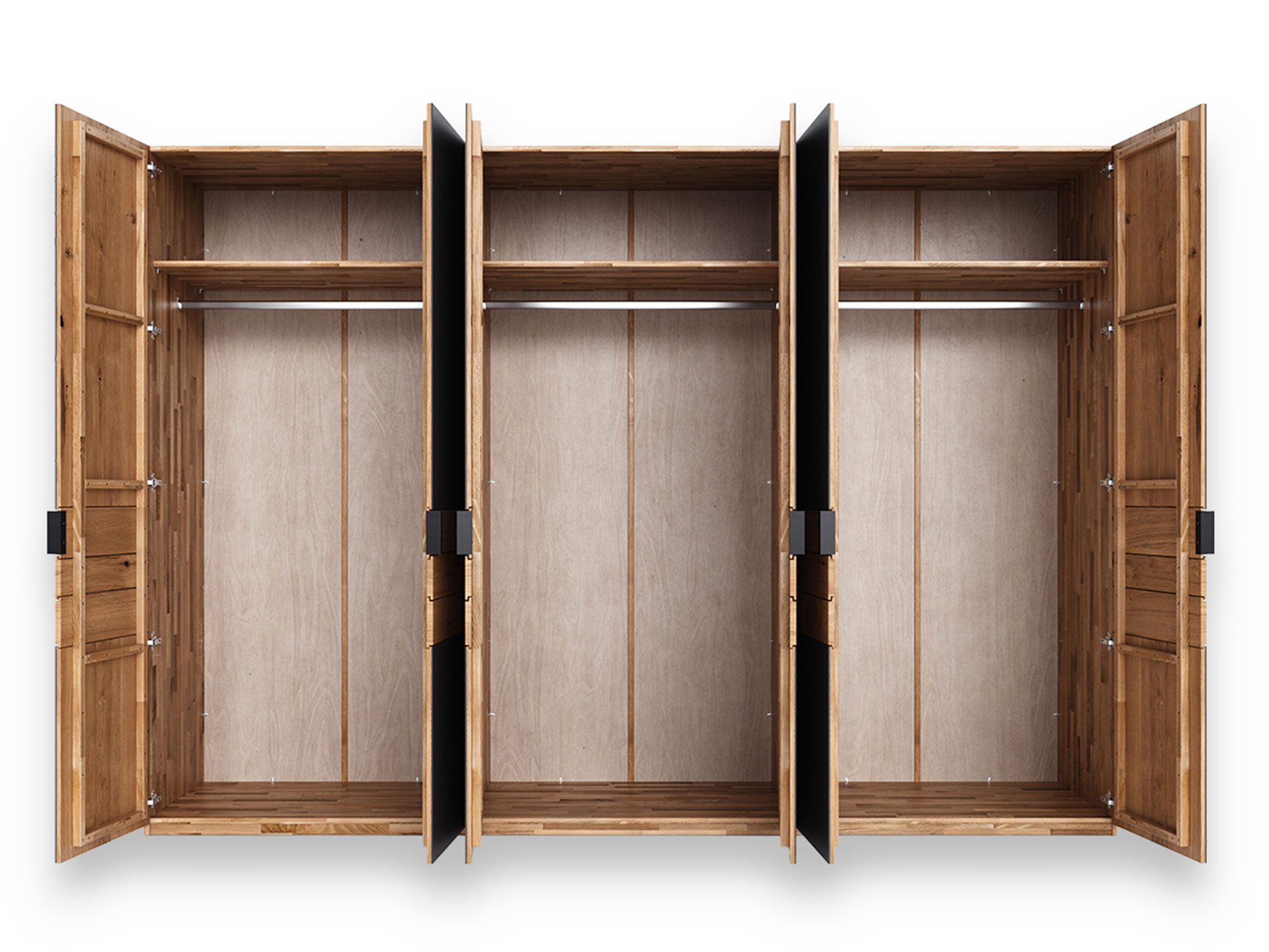 Za sześcioma frontami kryją się trzy oddzielne segmenty wyposażone w drążki na wieszaki oraz półki górne – idealne na ubrania, dodatki i tekstylia. To standardowa konfiguracja modelu K60EF1E. Jednak jeśli potrzebujesz więcej półek, przestrzeni na obuwie czy szuflad wewnętrznych, możemy dostosować wnętrze szafy do Twoich potrzeb. Każdy egzemplarz powstaje w naszej stolarni – dlatego Twoja szafa może być naprawdę Twoja, dopasowana do rytmu Twojego życia.