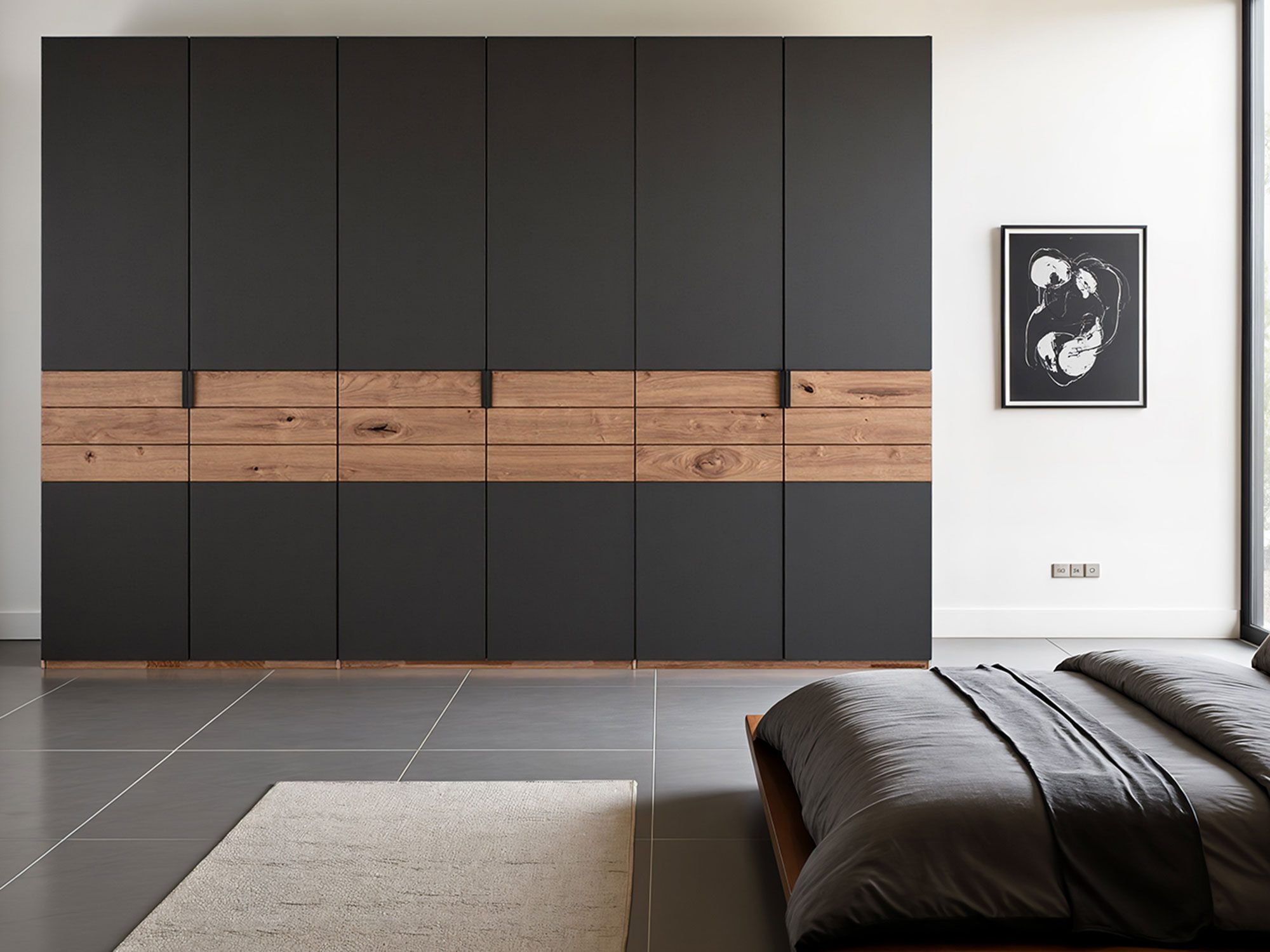Za sześcioma frontami kryją się trzy przestronne segmenty wyposażone w drążki na wieszaki oraz górne półki. To standardowa konfiguracja, która doskonale sprawdzi się w codziennym użytkowaniu – od przechowywania ubrań po pościel i dodatki. Jeśli jednak marzysz o indywidualnych rozwiązaniach, takich jak dodatkowe półki, szuflady wewnętrzne czy miejsce na obuwie – wystarczy, że skontaktujesz się z naszym biurem obsługi klienta. Jako producent, tworzymy meble we własnej stolarni i możemy dostosować wnętrze szafy do Twoich potrzeb.