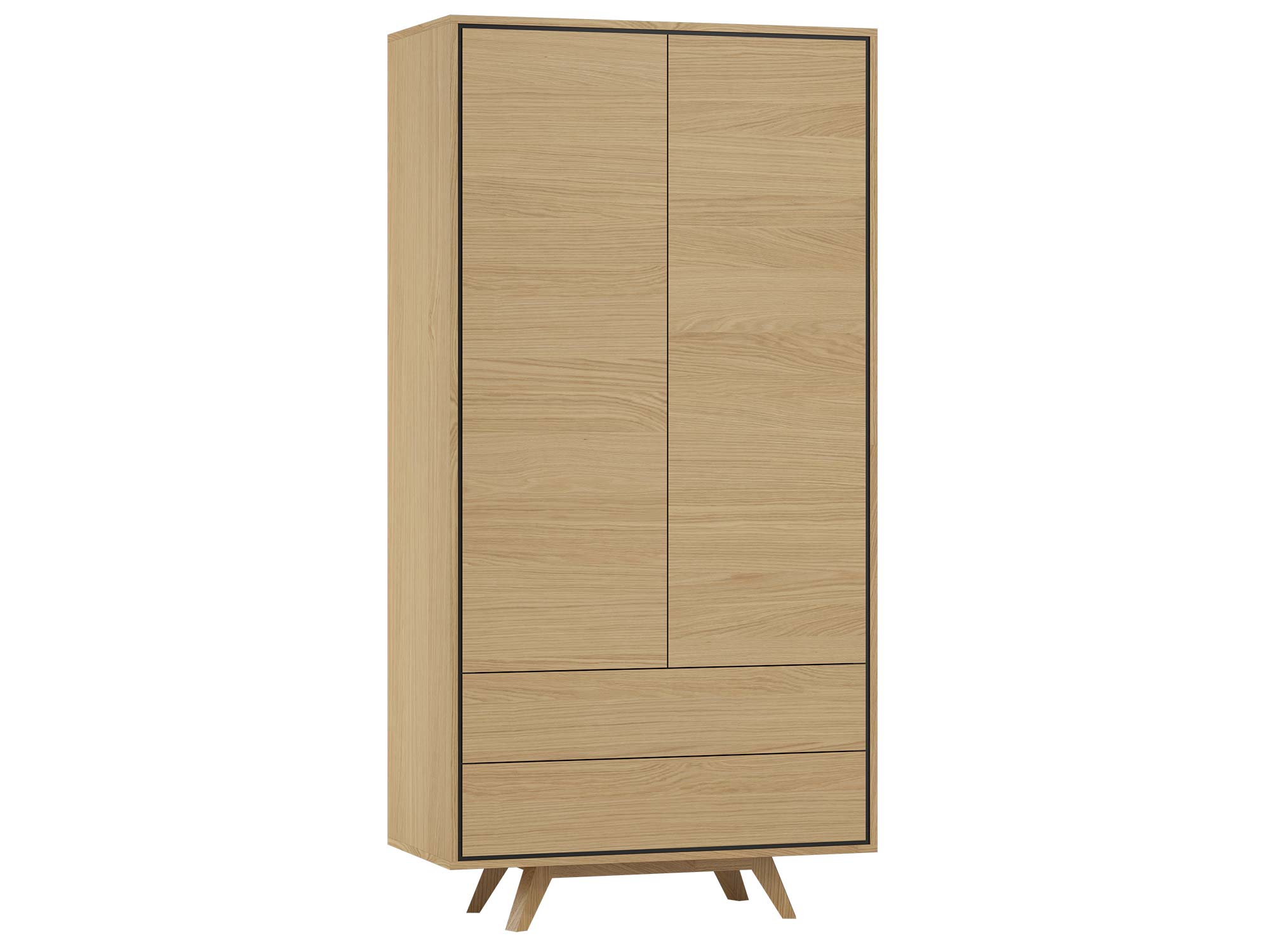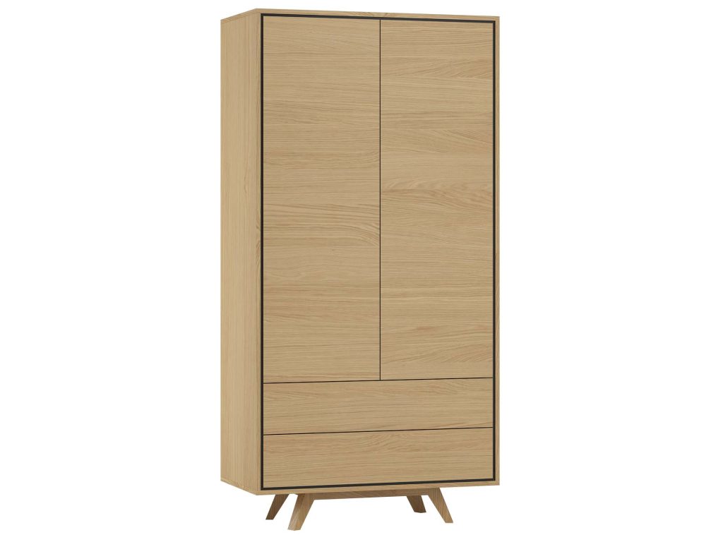 Skośne podstawy wykonane z litego drewna dębowego dodają całości lekkości i nowoczesnego sznytu, a geometryczne kształty podkreślają minimalistyczny styl mebla. Szafa posiada dwie pojemne szuflady oraz dwie przestronne części zamykane drzwiami, co pozwala w łatwy sposób zorganizować przestrzeń i zachować porządek. System „push to open”  ułatwia codzienne korzystanie i eliminuje konieczność stosowania uchwytów, co dodatkowo podkreśla nowoczesną formę.