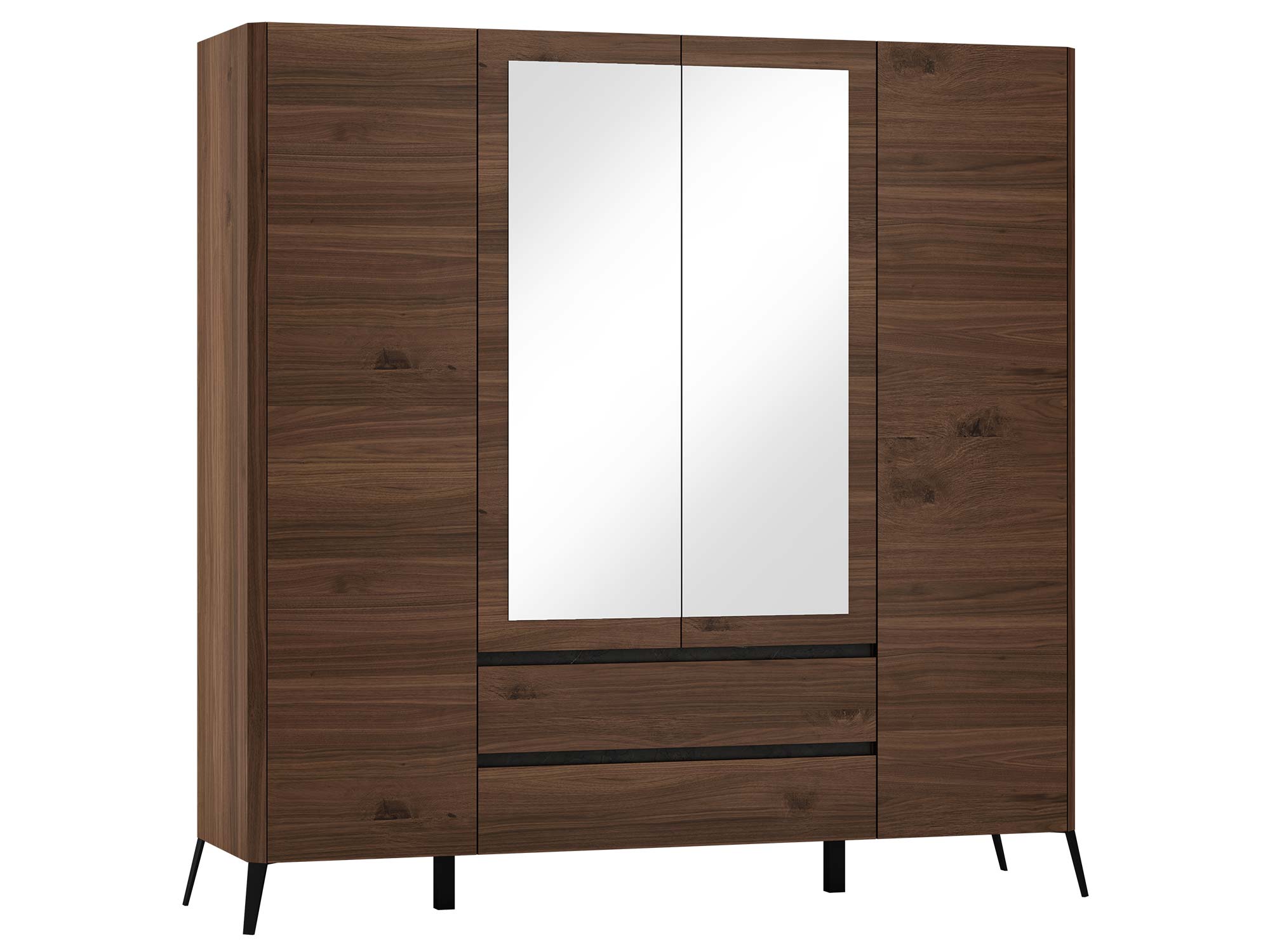 Szafa została wyposażona w aż cztery drzwi, które kryją pojemne przestrzenie do przechowywania ubrań, tekstyliów i dodatków. Dodatkowo dwie praktyczne szuflady z systemem maksymalnego wysuwu ułatwiają dostęp nawet do najgłębszych zakamarków, a system soft close zapewnia komfort użytkowania i bezszelestne zamykanie.
