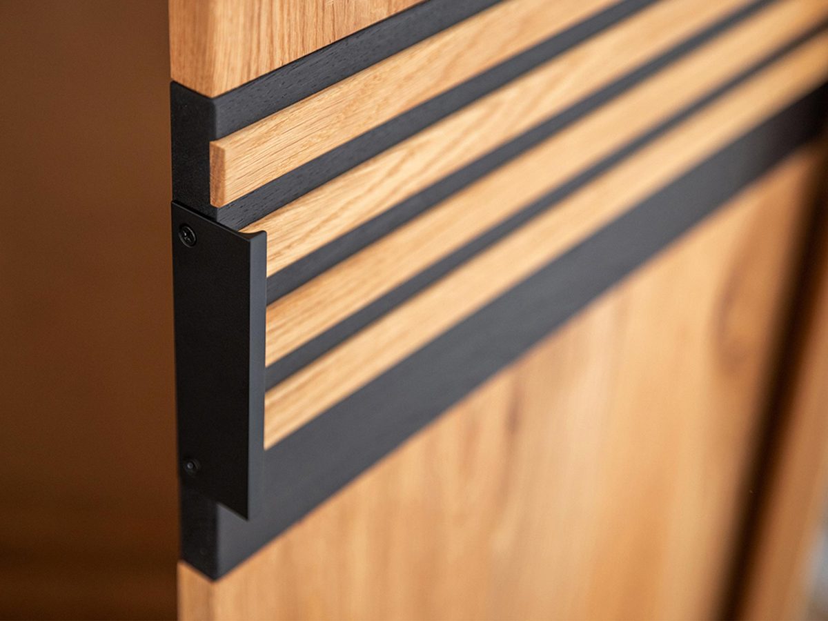 - Loftowy design: Złocisty odcień drewna w połączeniu z matową czernią lameli tworzy unikalną kompozycję.