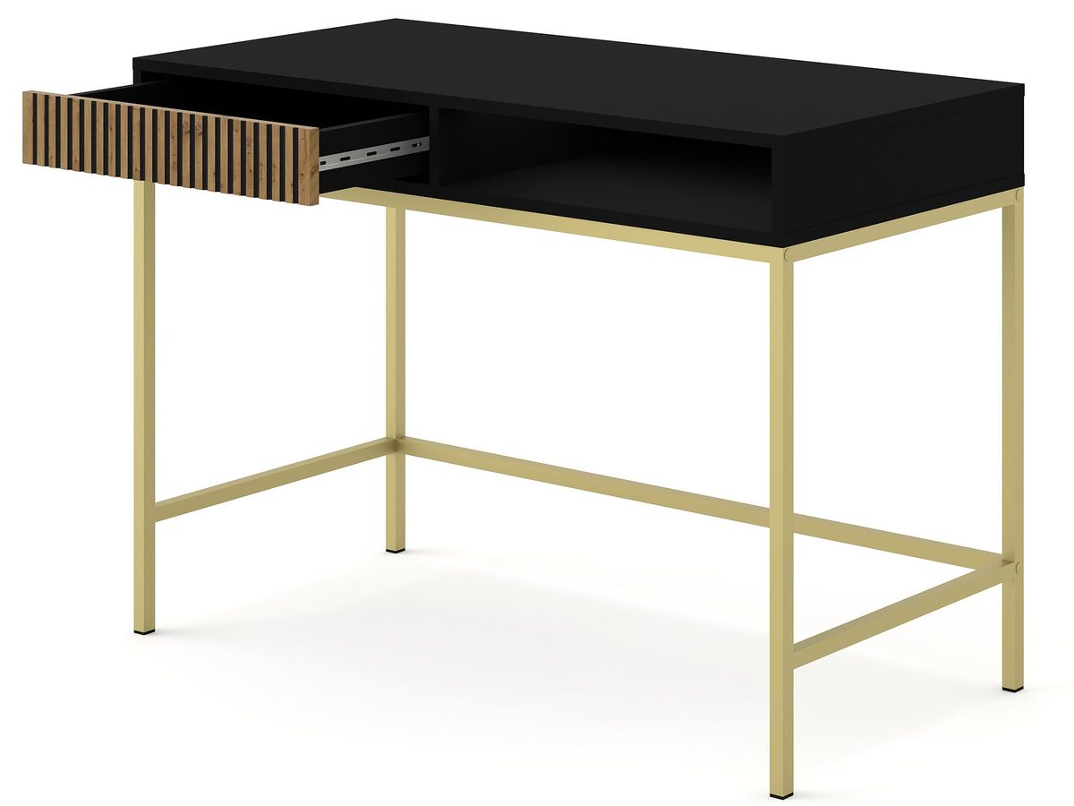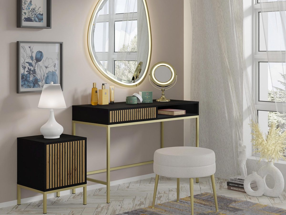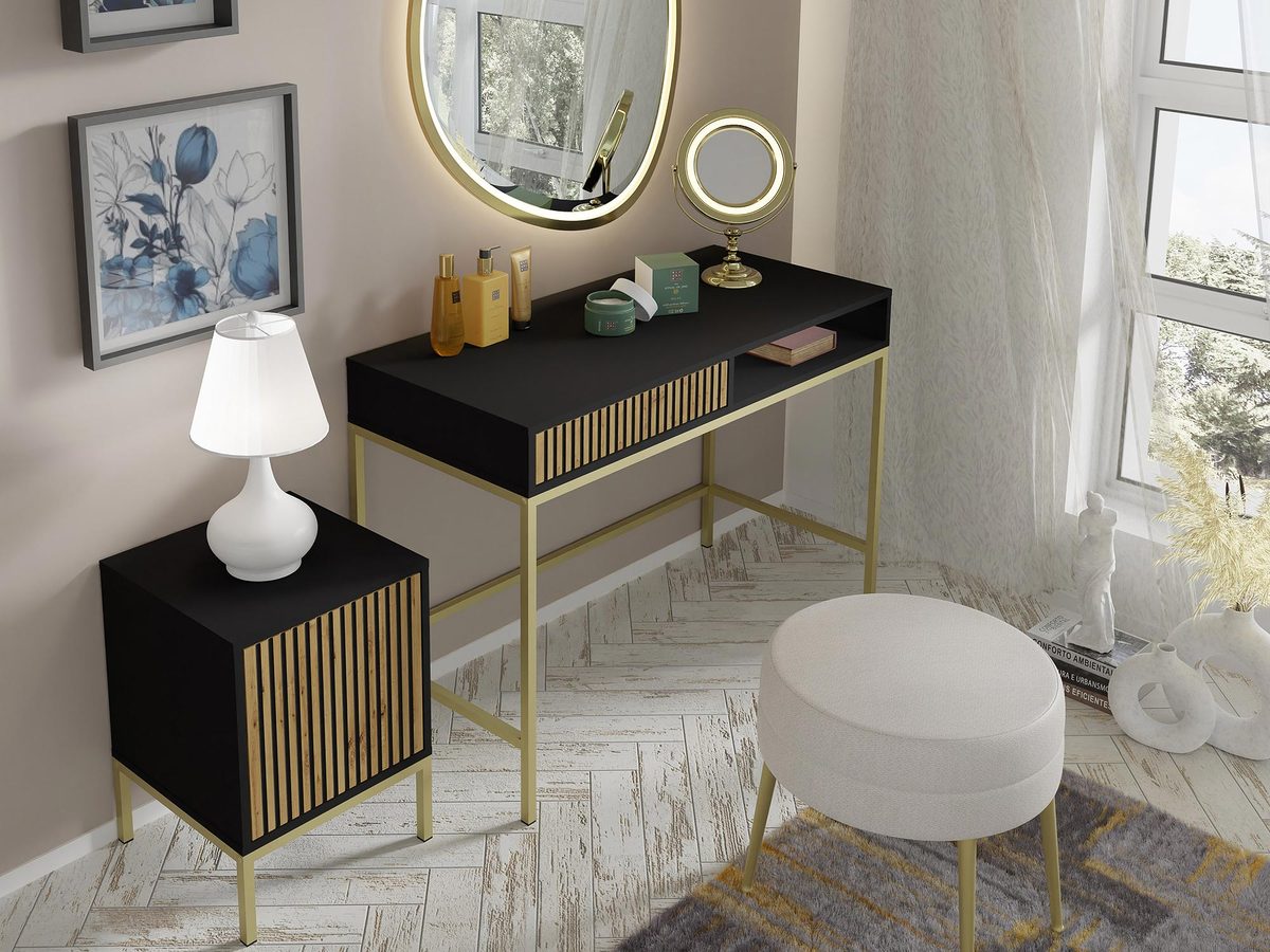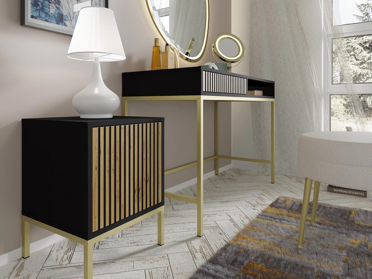 Stylowa Toaletka Navia z Praktyczną Półką wyróżnia się nowoczesnym wyglądem oraz solidnością wykonania. Korpus wykonany jest z płyty laminowanej, co zapewnia trwałość i odporność na codzienne użytkowanie. Fronty z frezowanej płyty MDF, malowane na elegancki kolor dębu artisan i czerni, dodają toaletce nowoczesności i klasy. Metalowe nogi w kolorze złotym podkreślają wyrafinowany charakter mebla i dodają mu lekkości.
