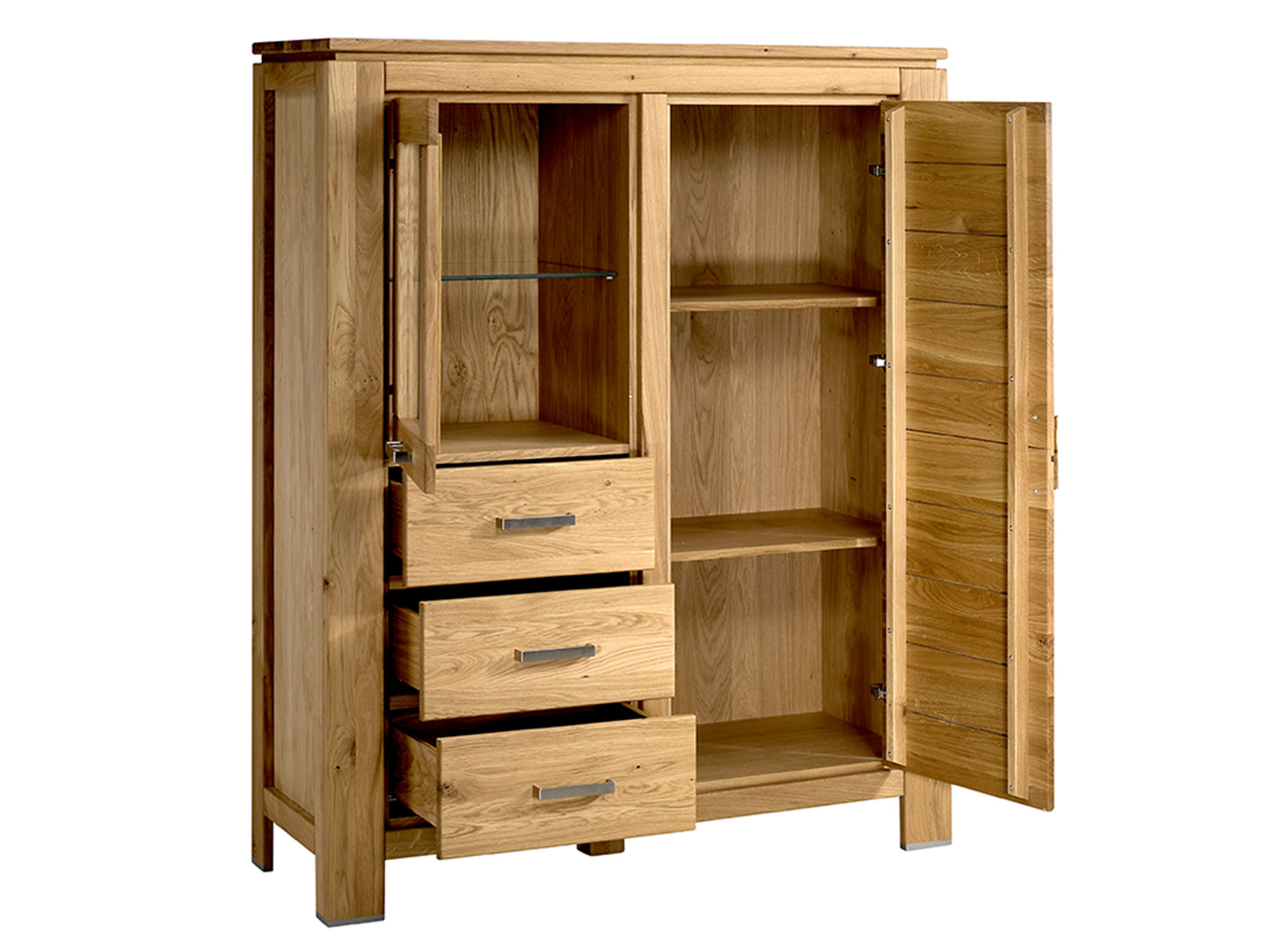 Gustowna i nowomodna szafka do salonu zrobiona z litego drewna dębowego najlepszego gatunku z fornirowanymi detalami idealnie dopasuje się do każdego wnętrza każdej jadalni oraz salonu. Dodatkowo stateczna forma i nowomodne, stylowe szlifowanie sprawią, że dębowa szafka niska szykownie upiększy niejedno pomieszczenie. Co więcej mebel ma funkcjonalne drzwiczki, przeszkloną część i pojemne szuflady. Dodatkowo ułatwiając przechowywanie i organizację zastawy stołowej, serwisów, sztućców oraz innych akcesoriów, a także pamiątek.