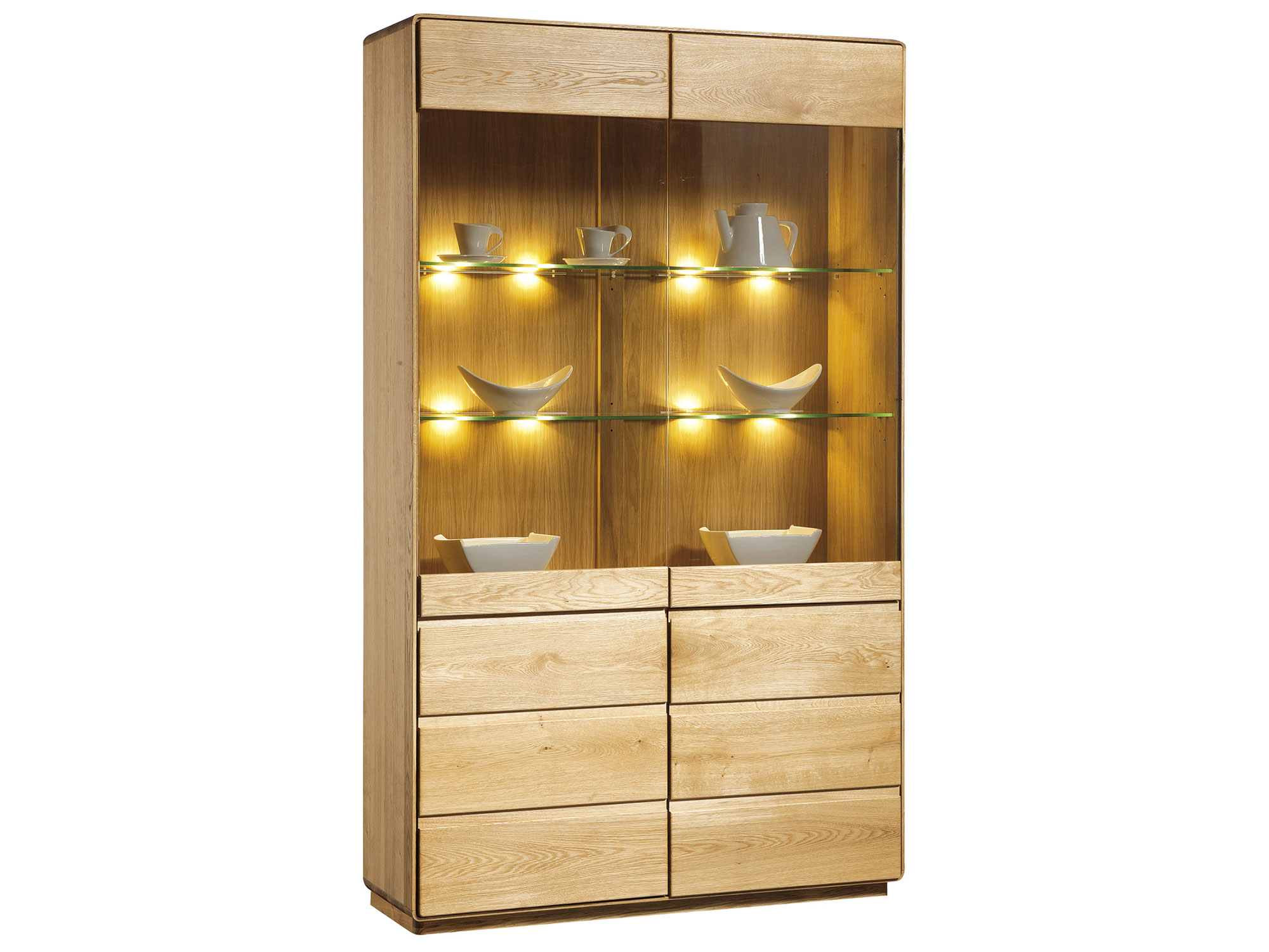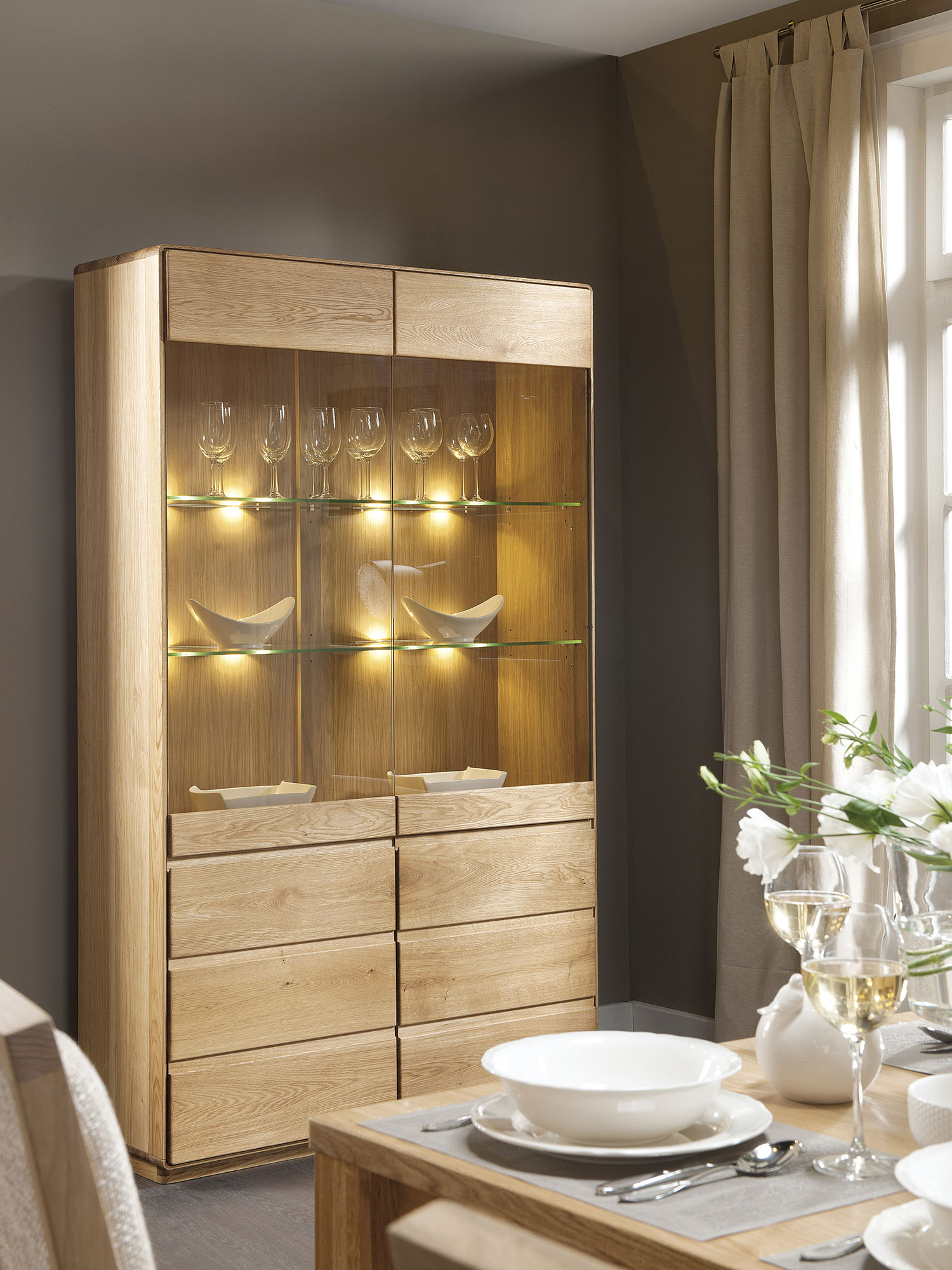 Gustowna i nowomodna drewniana witryna na książki do salonu Seto zrobiona z litego drewna dębowego najlepszego gatunku z fornirowanymi detalami idealnie dopasuje się do każdego wnętrza niejednej jadalni czy kuchni. Dodatkowo stabilna struktura oraz eleganckie, nowoczesne wykończenie sprawią, że witryna świetnie udekoruje niejedną jadalnię. Ponadto mebel posiada funkcjonalne drzwiczki ze szkłem na górze, gdzie można świetnie wyeksponować różne drobiazgi lub pamiątki oraz parę drzwi na dole, za którymi z powodzeniem zmieści się zastawa stołowa.
