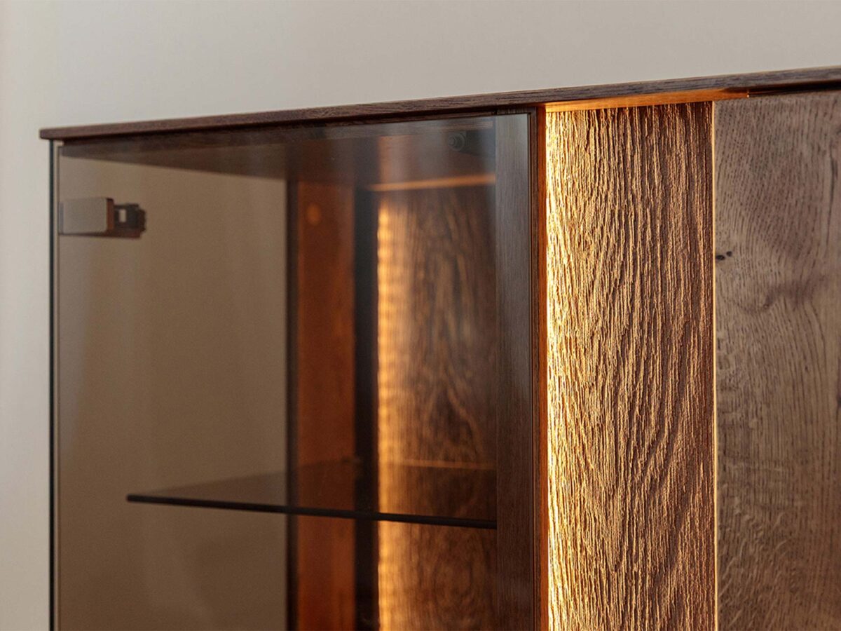 Witryna Essentia w wersji niskiej, podwójnej to mebel, który urzeka już od pierwszego spojrzenia. Dąb dziki w wykończeniu tabacco z wyraźnym rysunkiem słojów i delikatnym połyskiem olejowanej powierzchni tworzy niepowtarzalny klimat. Każdy egzemplarz jest inny – wykonany z unikalnego kawałka drewna, co nadaje mu charakteru i autentyczności. Subtelne światło LED rozświetla przeszkloną część witryny, wprowadzając do wnętrza atmosferę ciepła i przytulności.