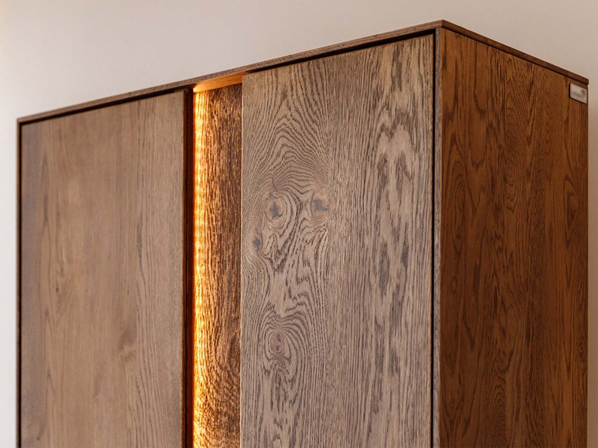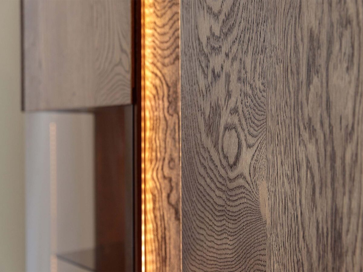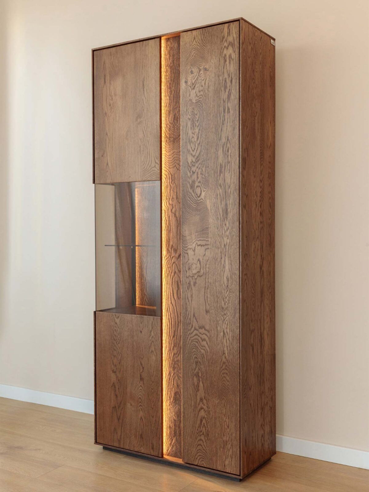 Witryna dębowa tabacco Essentia – materiał, światło i detale