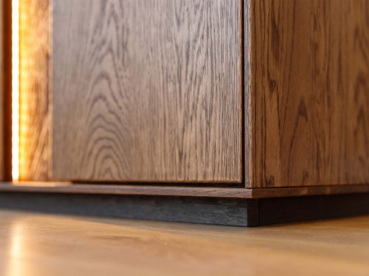 Siła tej bryły tkwi w połączeniu trzech elementów: materiału, wykończenia i światła. Korpus i fronty wykonane z dębu dzikiego – litego niosą ze sobą autentyczność, której nie da się podrobić. Każdy słój i naturalne niuanse barwy opowiadają własną historię. Olejowanie podbija głębię koloru tabacco, eksponuje rysunek drewna i chroni powierzchnię przed śladami codziennego użytkowania, pozostawiając przyjemny w dotyku półmat.