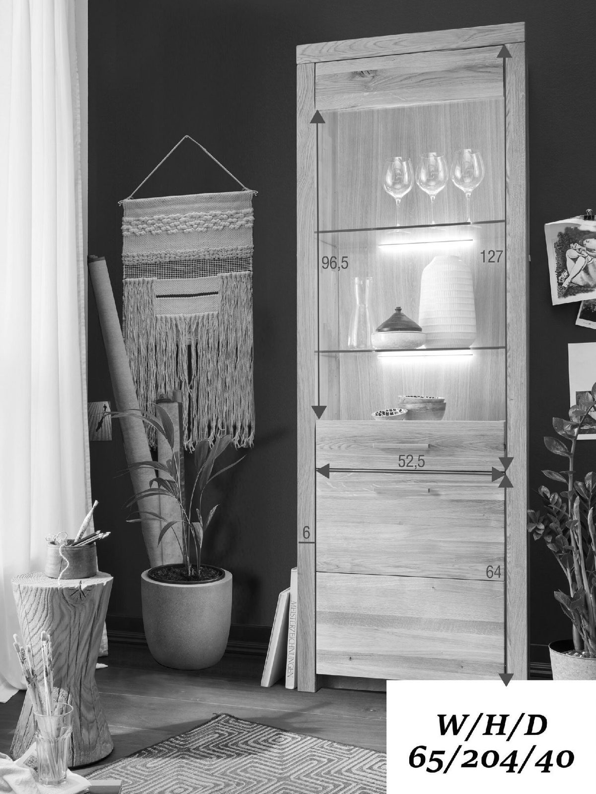 - Bez oświetlenia: Ta witryna nie posiada wbudowanego oświetlenia, co pozwala na większą swobodę w doborze oświetlenia według własnego gustu.