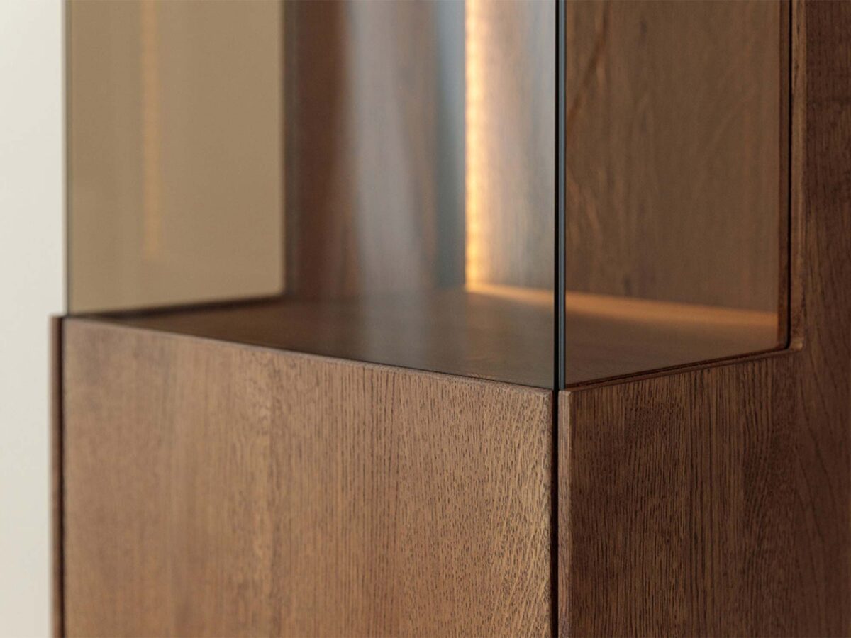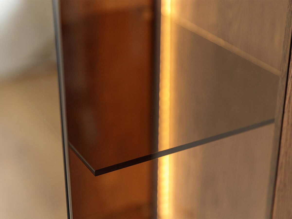Zintegrowane oświetlenie LED dodaje meblowi charakteru – ciepłe światło wydobywa detale przechowywanych przedmiotów i buduje atmosferę przytulności. Po zmroku witryna staje się nie tylko miejscem przechowywania, ale również źródłem nastrojowego światła, które ociepla każde wnętrze.