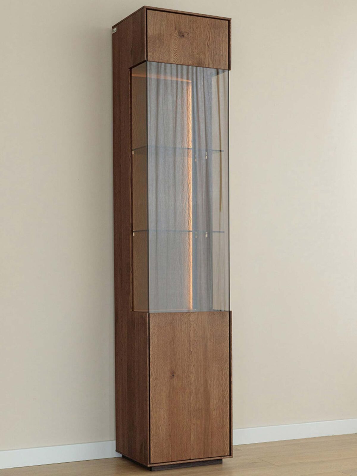 Front otwierany jest za pomocą systemu tip-on, co oznacza, że wystarczy lekkie naciśnięcie, aby drzwi otworzyły się płynnie i bez wysiłku. Brak uchwytów wzmacnia minimalistyczny, industrialny charakter bryły i pozwala wyeksponować naturalne piękno drewna. Witryna w wersji wąska prawa jest idealna do ustawienia po prawej stronie kompozycji lub jako samodzielny mebel podkreślający geometrię przestrzeni.