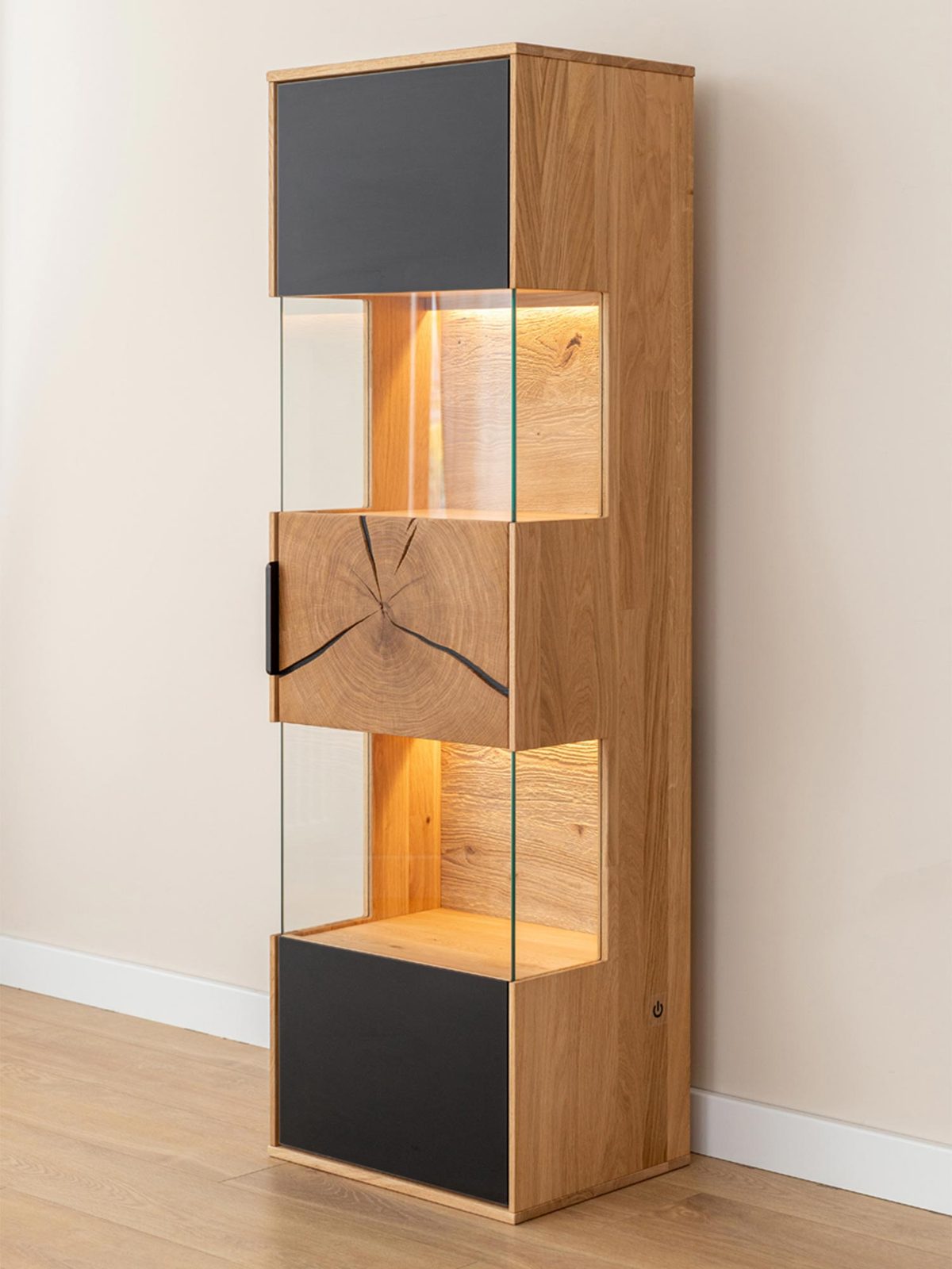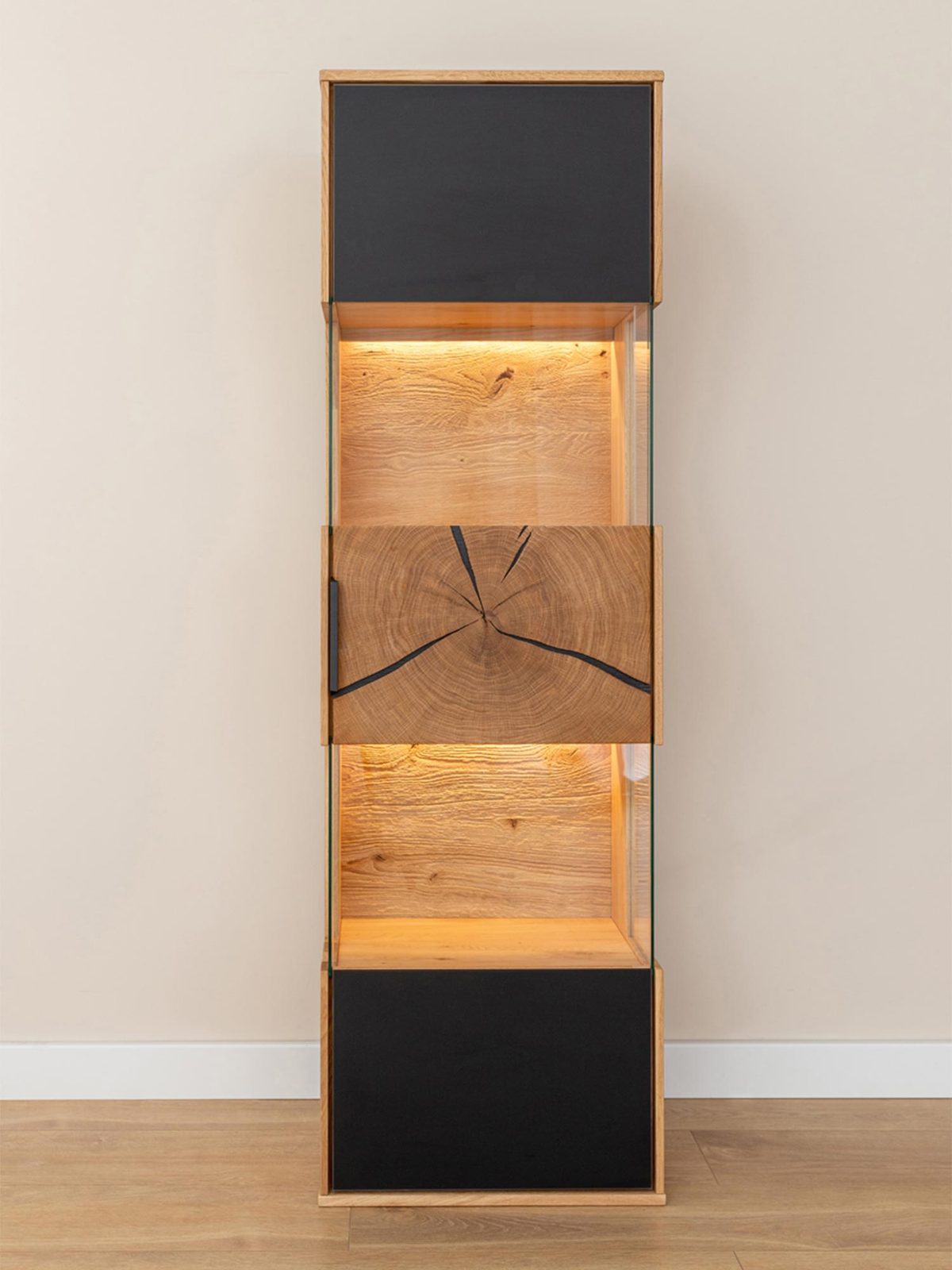 • Unikalne połączenie materiałów – Naturalne drewno dębowe zestawione z czarnym szkłem tworzy niepowtarzalny duet, który wprowadza do wnętrza nowoczesność i elegancję.