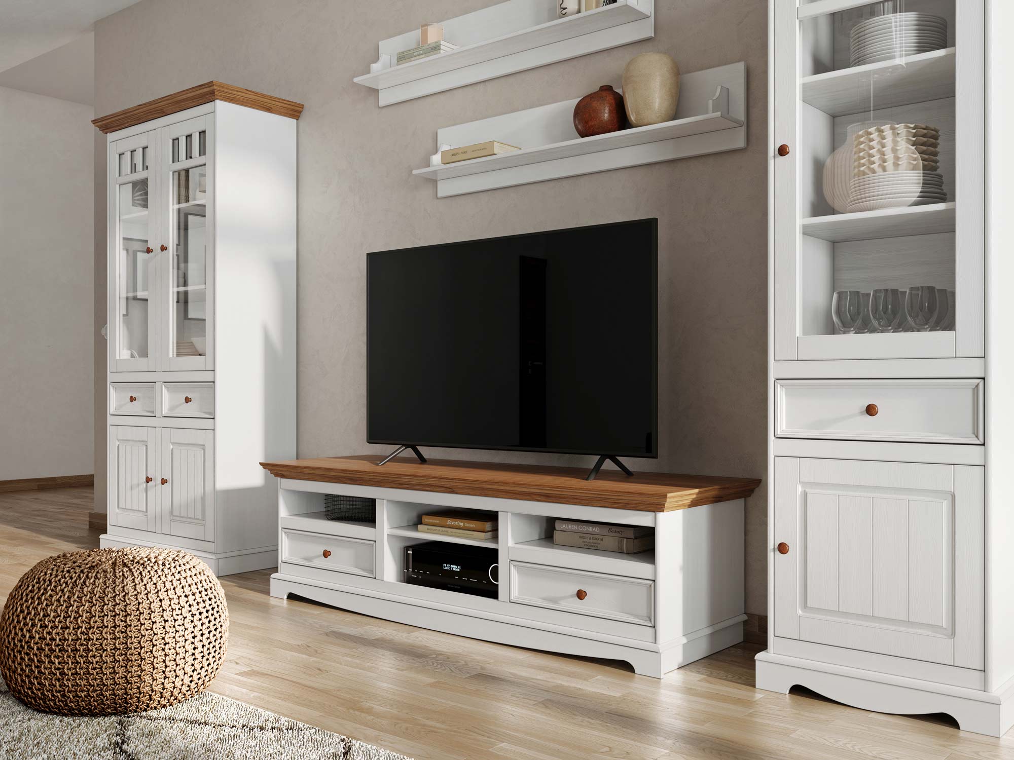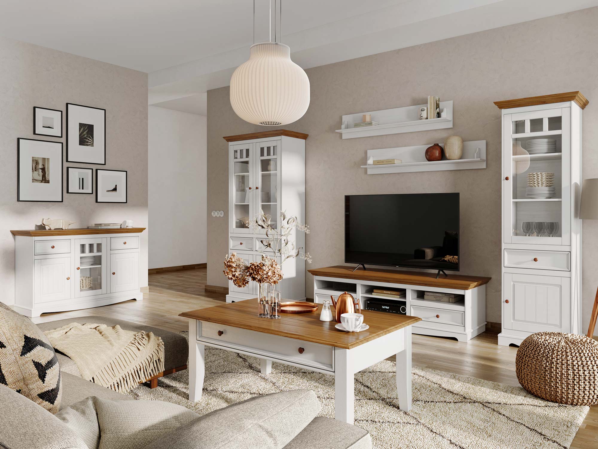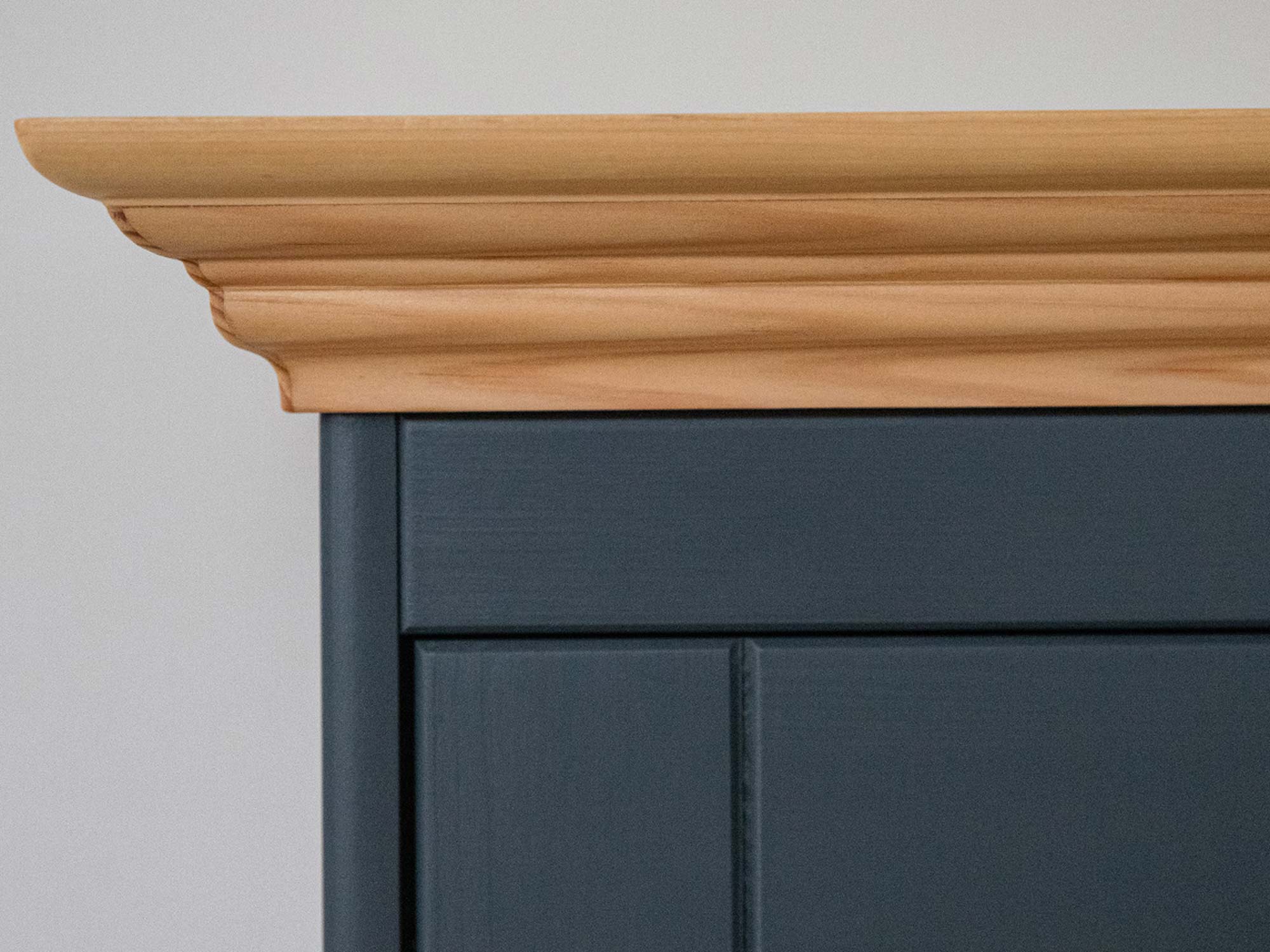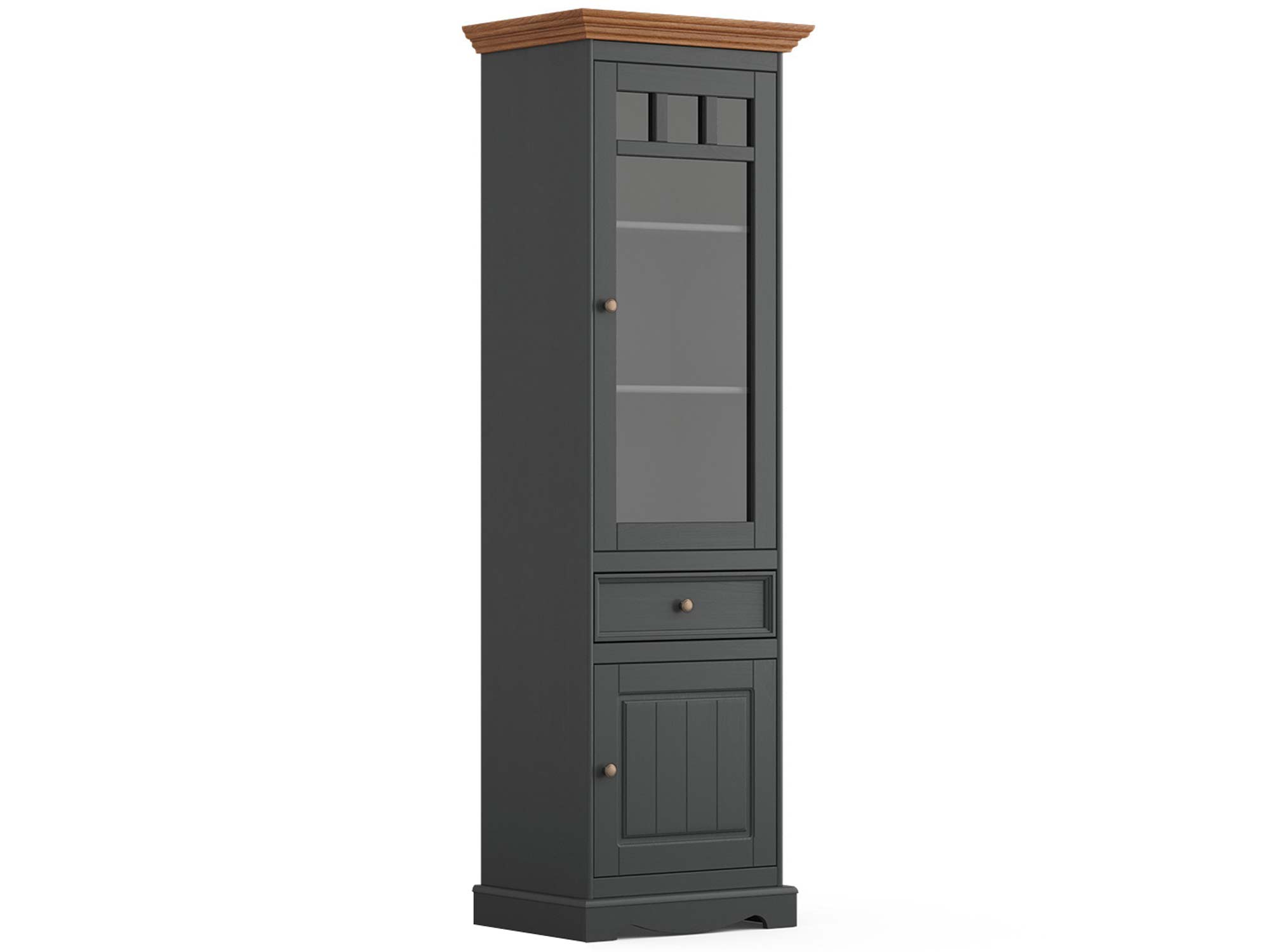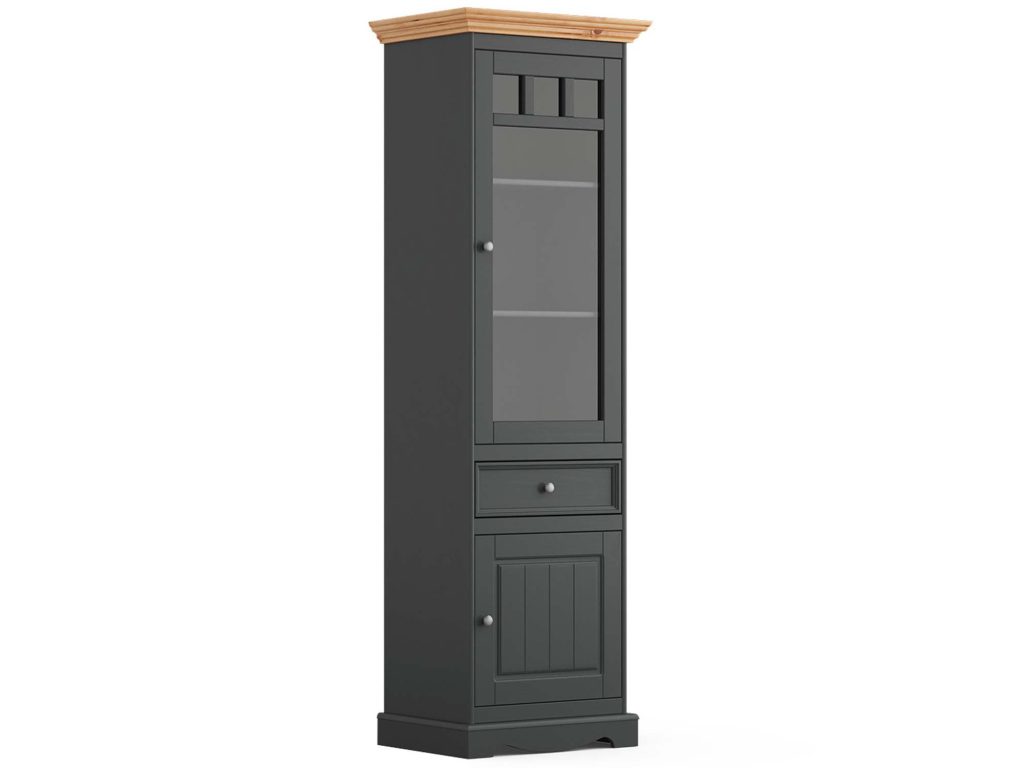 Dodatkowo przedstawiona drewniana witryna słupek do salonu na styl prowansalskim INGRID dostępna jest w kilku wersjach kolorystycznych. Zaczynając od klasycznego odcienia bieli w całości, co sprawdzi się w znacznej większości wnętrz o charakterze klasycznym, kończąc na odważnym połączeniu grafitu z sosnowymi blatami. Zdecydowanie jest to wariant dla osób ceniących niekonwencjonalne rozwiązania we wnętrzu. Ponadto różnorodność w wybarwieniu zarówno korpusu jak i wieńca pozwala na stworzenie kreatywnego i unikalnego jak i prostego wnętrza. Z tego względu z pewnością każdy znajdzie wariant dopasowany do swojego gustu.