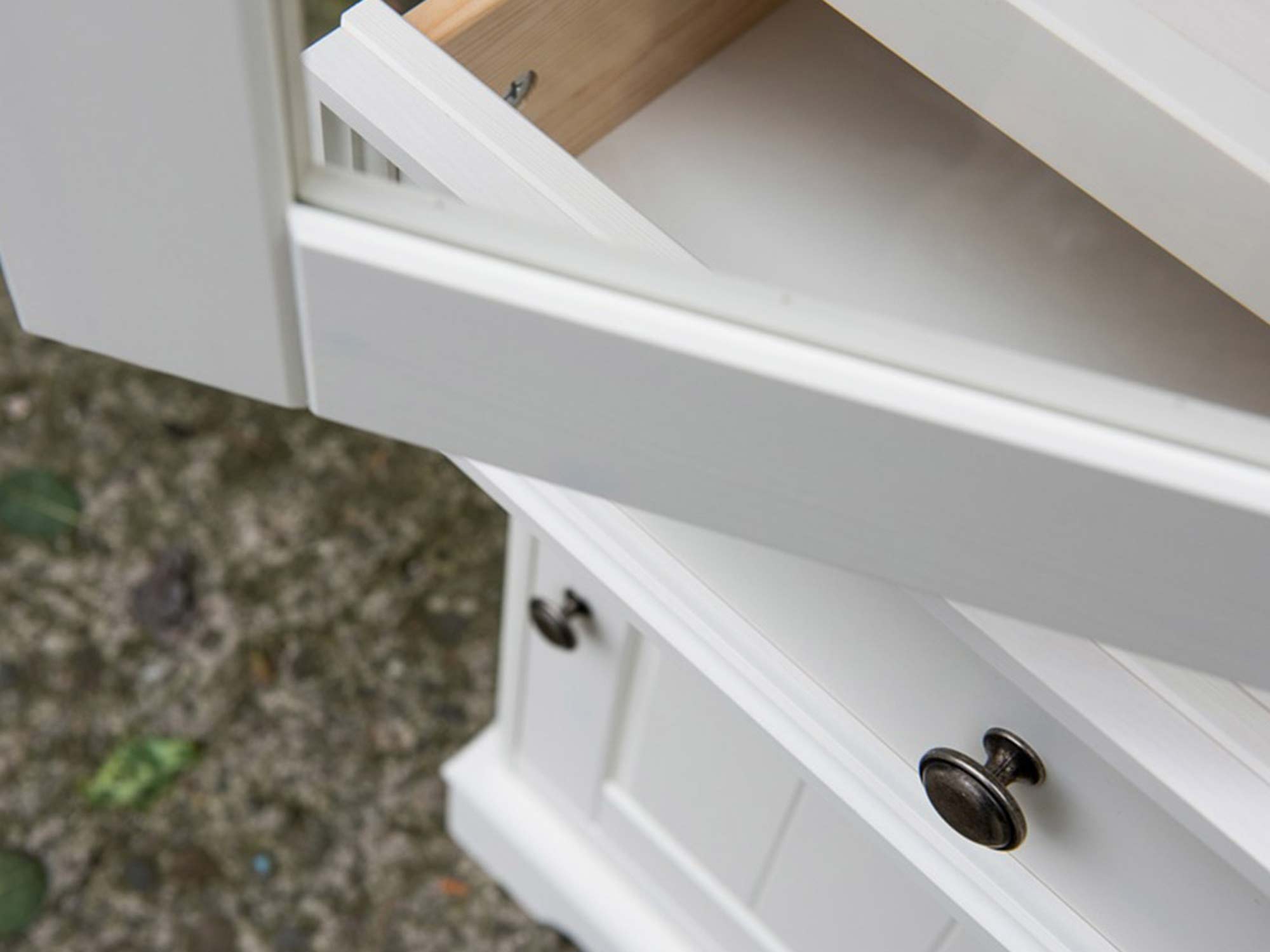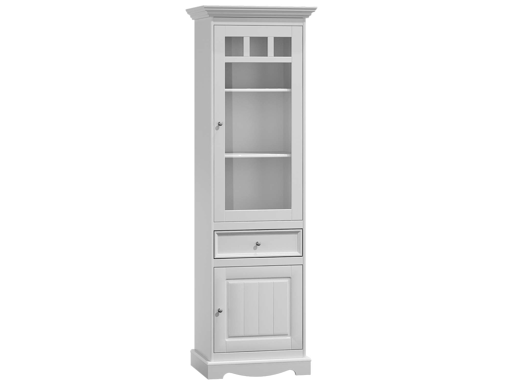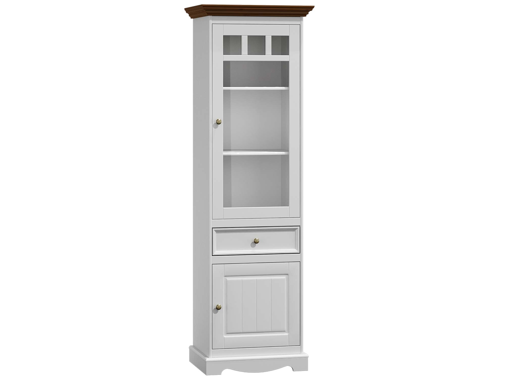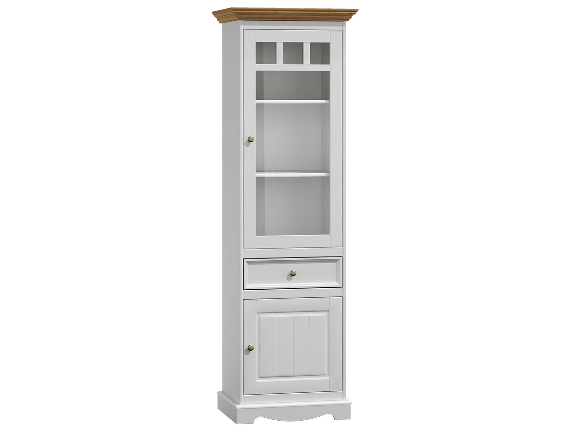Sosnowa witryna słupek INGRID to propozycja do salonu, jadalni czy biura zachwycający swoją funkcjonalnością oraz niezwykle gustownym wyglądem. Co istotne, posiada dużą przeszkloną przestrzeń z półkami, gdzie można wyeksponować zestaw kawowy, domowe szkło, statuetki czy pamiątki rodzinne. Z kolei szuflada to miejsce na drobne rzeczy, które zawsze chcemy mieć pod ręką. Dodatkowo zastosowanie prowadnic z cichym domykiem znacznie ułatwia użytkowanie oraz chroni mebel przed uszkodzeniami. Co więcej przestrzeń na samym dole to również kolejne miejsce na przechowywanie. Mimo swoich niedużych gabarytów jest to mebel bardzo funkcjonalny, gdyż zajmuje mało miejsca w przestrzeni, nie przytłacza jej a posiada sporo miejsca na organizację. Ponadto praktyczne uchwyty stylizowane są na stare złoto, co dodaje meblu charakteru oraz klimatu vintage. Korpus mebla został pokryty ekologiczną farbą wodną o odcieniu ciepłej bieli o niepełnym kryciu, dzięki czemu dostrzegalna i wyczuwalna jest pod opuszkami palców naturalna struktura drewna. Zarówno korpus jak i wieniec zdobią efektowne frezy, które nadają mu klasy i charakteru.