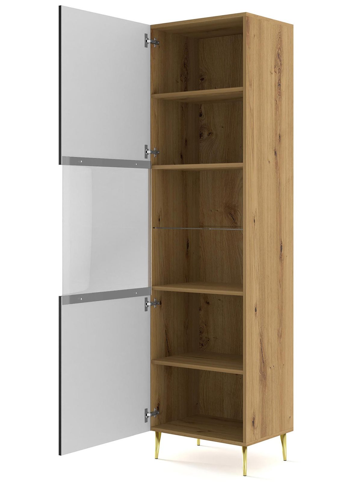 - Funkcjonalność: Witryna Navia oferuje dużo miejsca do przechowywania i eksponowania przedmiotów dzięki przemyślanemu rozkładowi półek i szuflad. Szklane drzwiczki umożliwiają łatwe wyeksponowanie najcenniejszych rzeczy, jednocześnie chroniąc je przed kurzem.