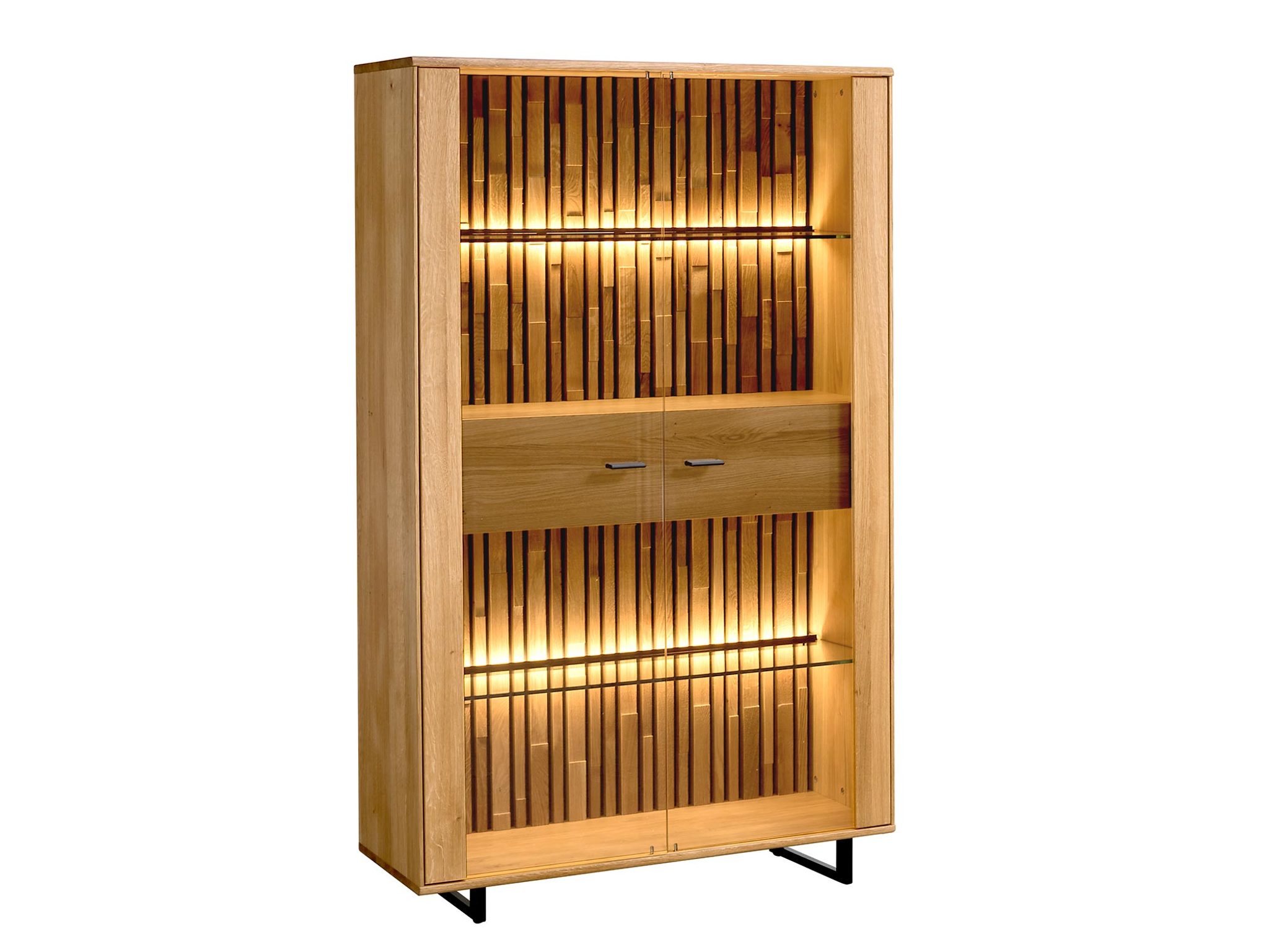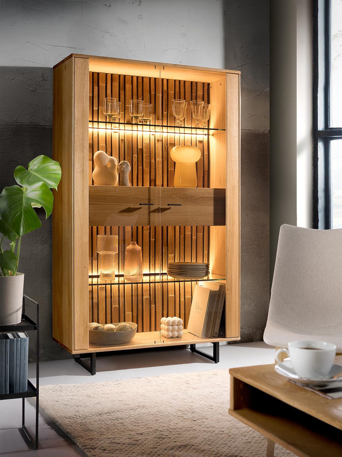 Stylowa Witryna z Czarnymi Nóżkami Sole wyróżnia się nie tylko swoim pięknem, ale także praktycznością. Ozdobne dębowe lamelki na tylnych ścianach oraz ciepłe oświetlenie tworzą wyjątkowy klimat w każdym pomieszczeniu. Witryna jest idealna do przechowywania i eksponowania ulubionych przedmiotów, dodając wnętrzu ciepła i elegancji.