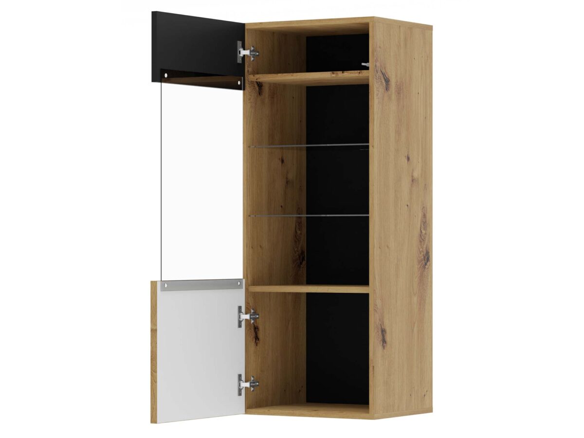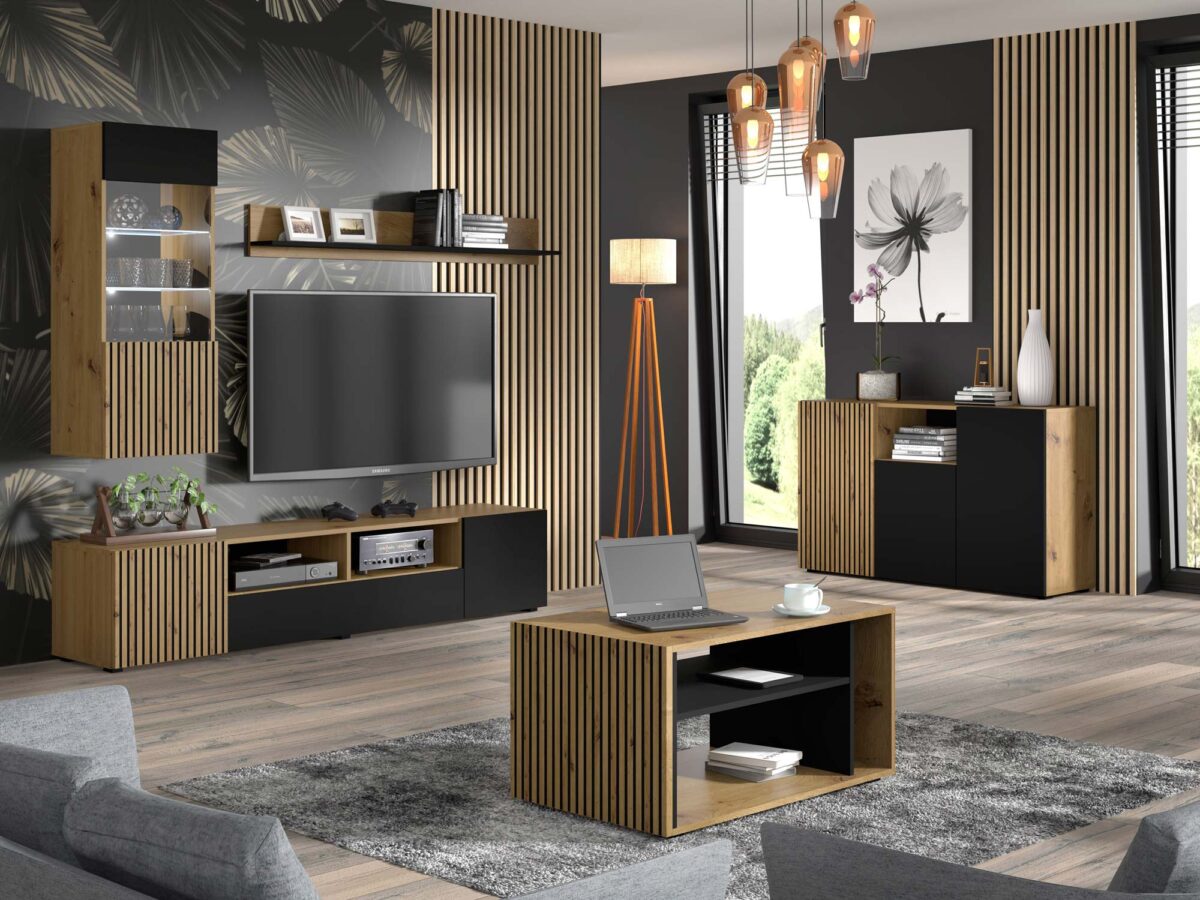 Prezentowana witryna wchodzi w skład mebli systemowych MERVE, które wyróżniają się nieszablonowym połączeniu czarnego matu z naturalnym odcieniem drewna, które zdecydowanie zwraca uwagę. Dodatkowo jest to doskonały wybór dla wnętrz projektowanych w stylu nowoczesnym, loftowym czy rustykalnym. Co więcej, meble wyróżniają również fronty z lameli, które zostały wykonane z wysokiej jakości płyty MDF. Ponadto meble nie przytłaczają aranżacji oraz prezentują się we wnętrzu niezwykle szykownie. Dodatkowo podczas tworzenia kolekcji stawiano nie tylko na estetykę, ale przede wszystkim na funkcjonalność. Z tego względu zastosowano wiele szafek oraz szuflad, dzięki czemu organizacja jest znacznie usprawniona. Co więcej, meble nie posiadają uchwytów, a meble otwierane są za pomocą nowoczesnego systemu push to open.