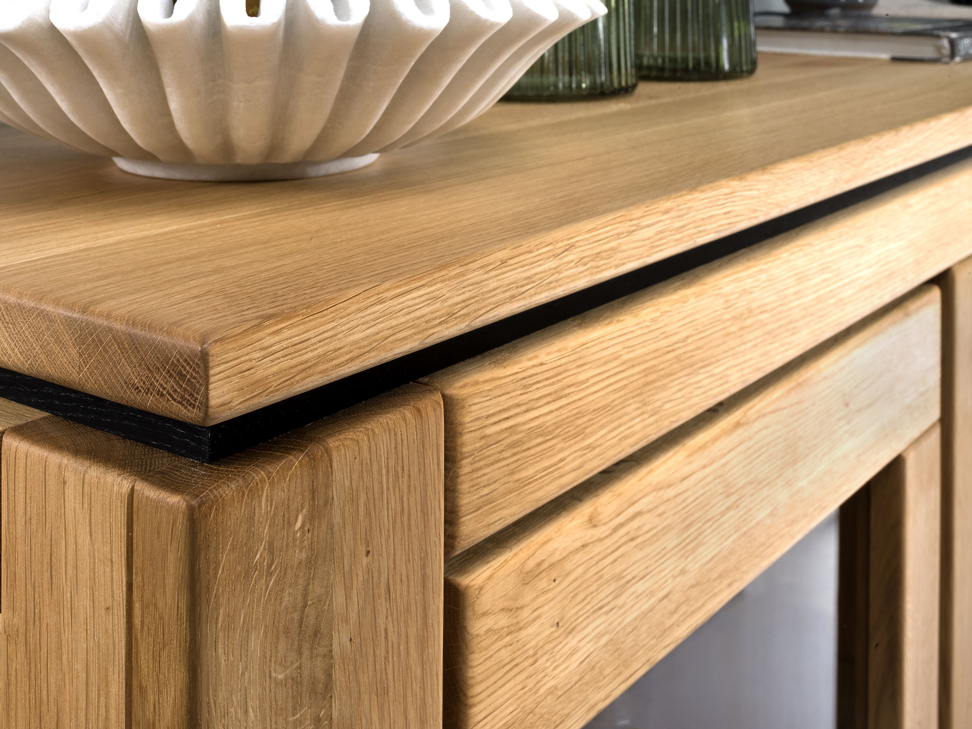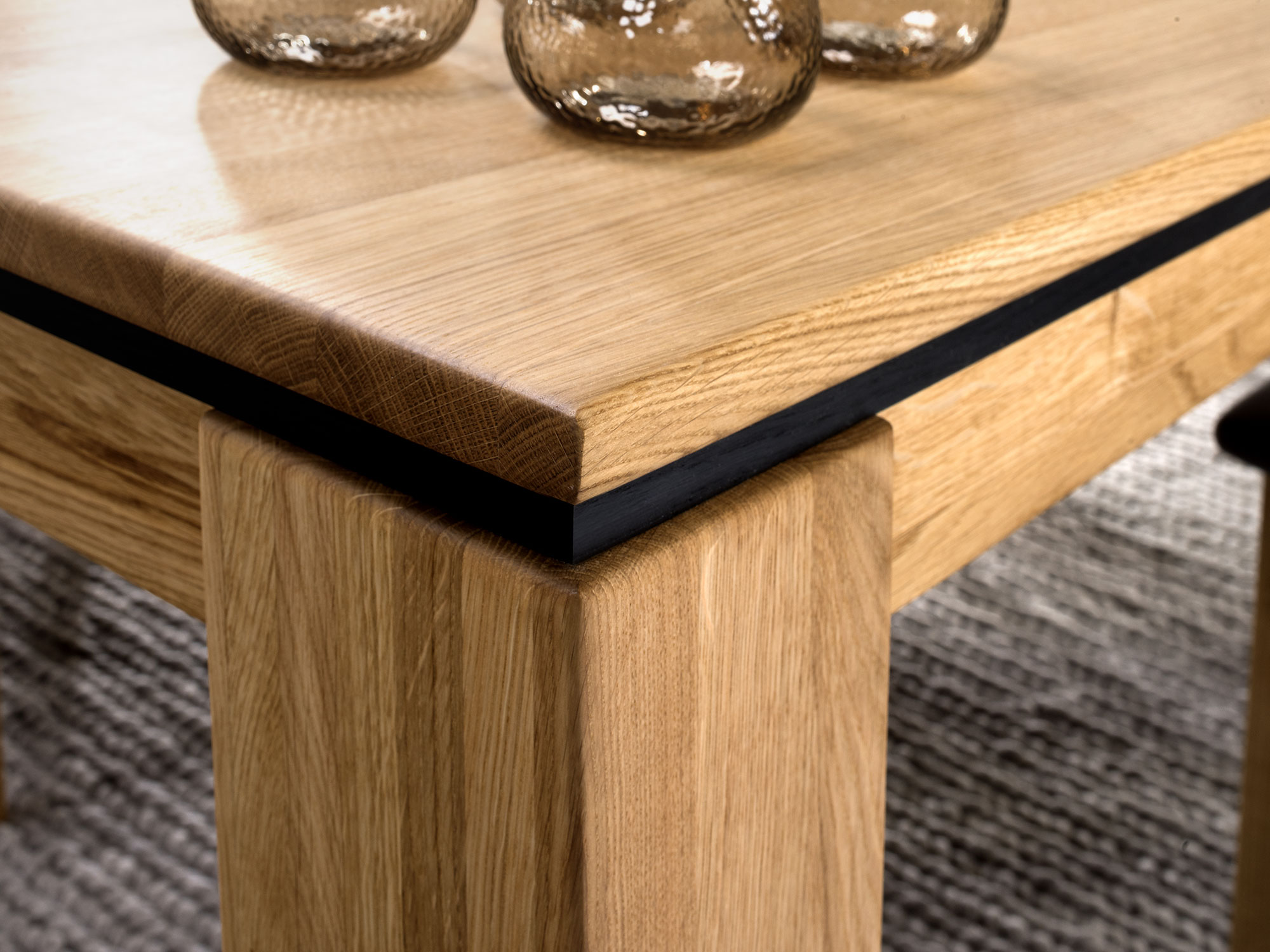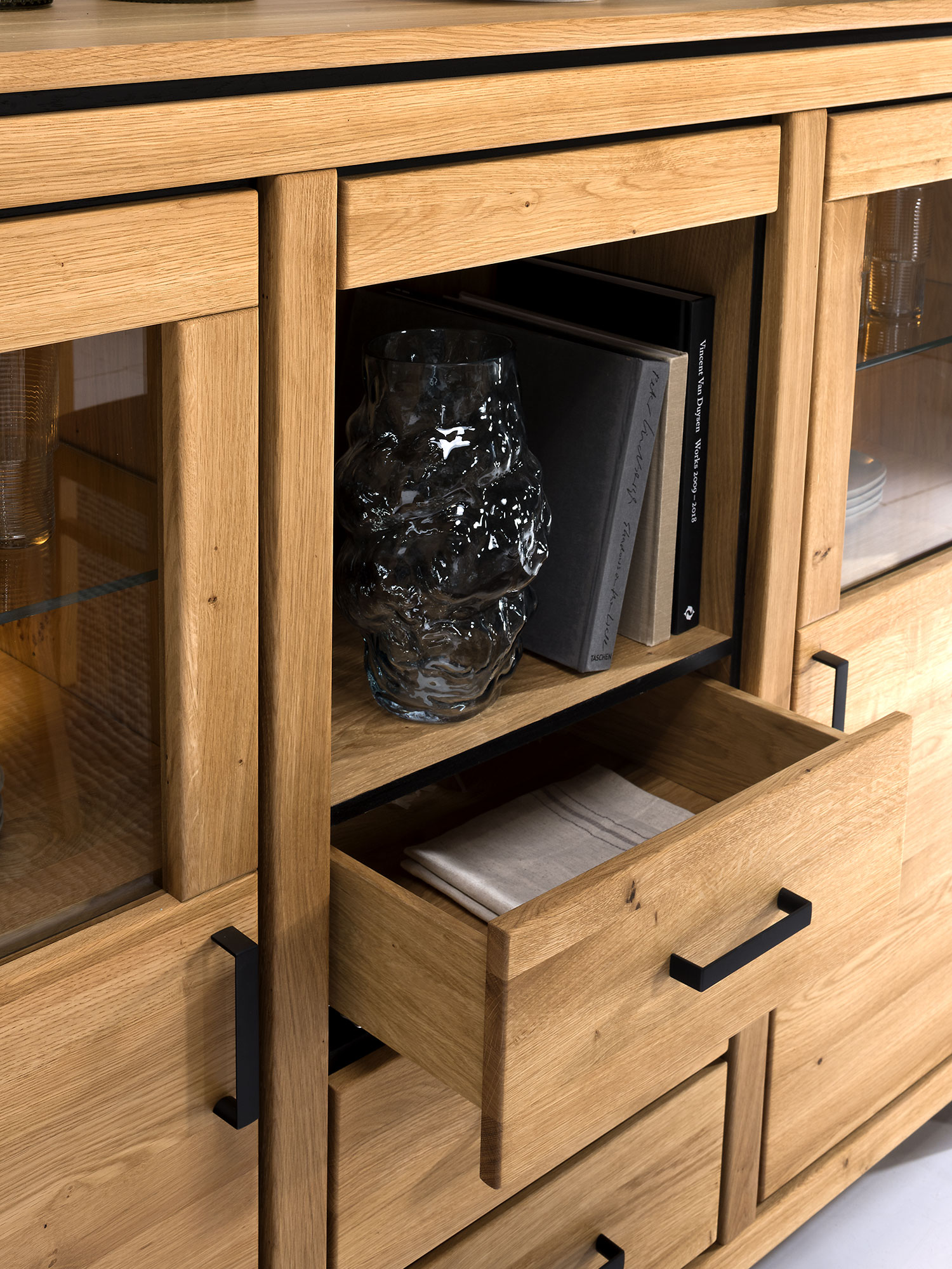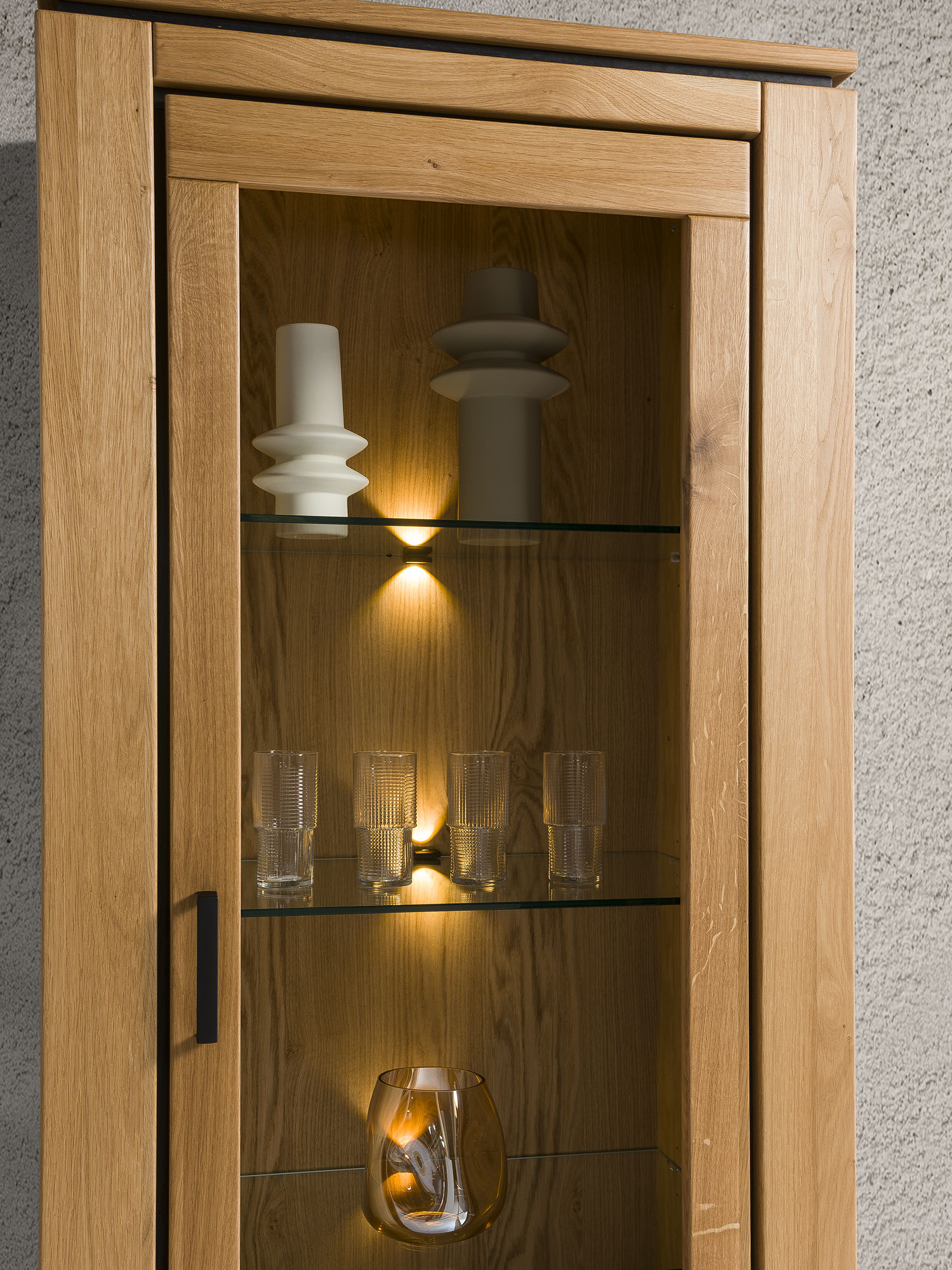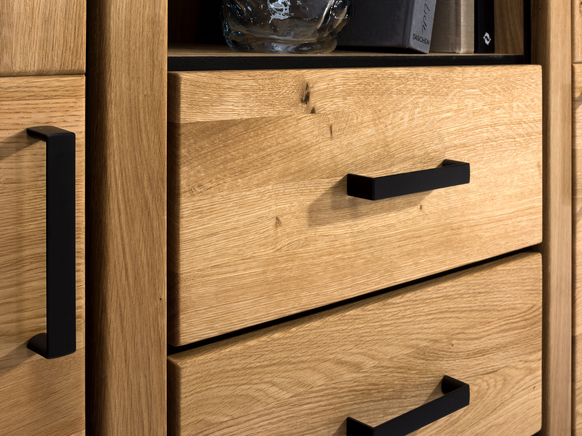 Nieodłącznym elementem, który nadaje witrynie nowoczesnego charakteru, są czarne uchwyty oraz detale w postaci czarnych listew i stopek. Dzięki tym wyrazistym dodatkom, mebel staje się jeszcze bardziej efektowny i stylowy. Czerń w połączeniu z ciepłym odcieniem drewna dębowego tworzy kontrast, który przyciąga uwagę i nadaje meblowi nowoczesnego, odświeżonego wyglądu.