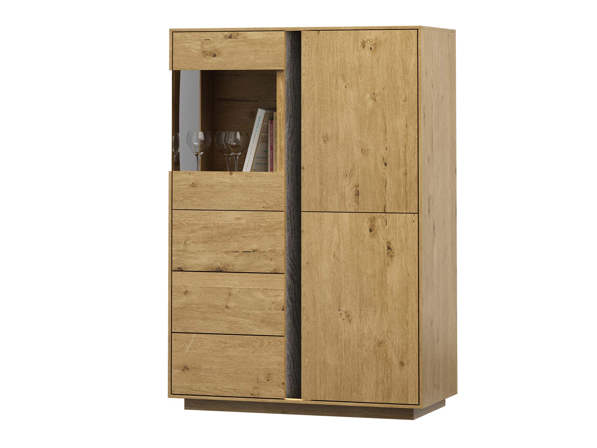 Witryna 3D3S to świadome połączenie ekspozycji i przechowywania. Część przeszklona pozwala wyeksponować szkło, porcelanę i dekoracje, a trzy zamknięte segmenty oraz trzy szuflady dbają o porządek w rzeczach mniej reprezentacyjnych. Całość utrzymana jest w spójnej estetyce: naturalna okleina z elementami litego drewna prezentuje rysunek słojów, który wprowadza do wnętrza ciepło i autentyczność.