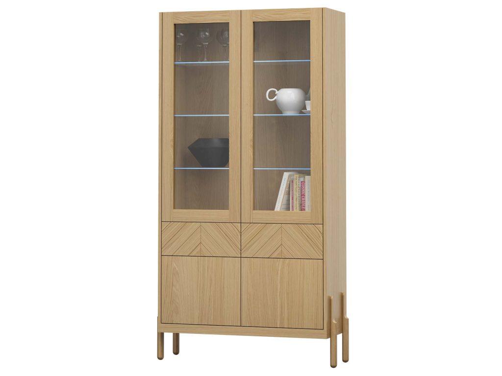 Dzięki przemyślanej konstrukcji, witryna łączy zamknięte przestrzenie do przechowywania z możliwością ekspozycji dekoracji, porcelany, książek czy pamiątek rodzinnych. Cztery drzwi i dwie pojemne szuflady zapewniają maksymalny komfort użytkowania. System push-to-open gwarantuje wygodę – wystarczy delikatny nacisk, by otworzyć fronty, co pozwala zachować minimalistyczny wygląd mebla bez uchwytów.