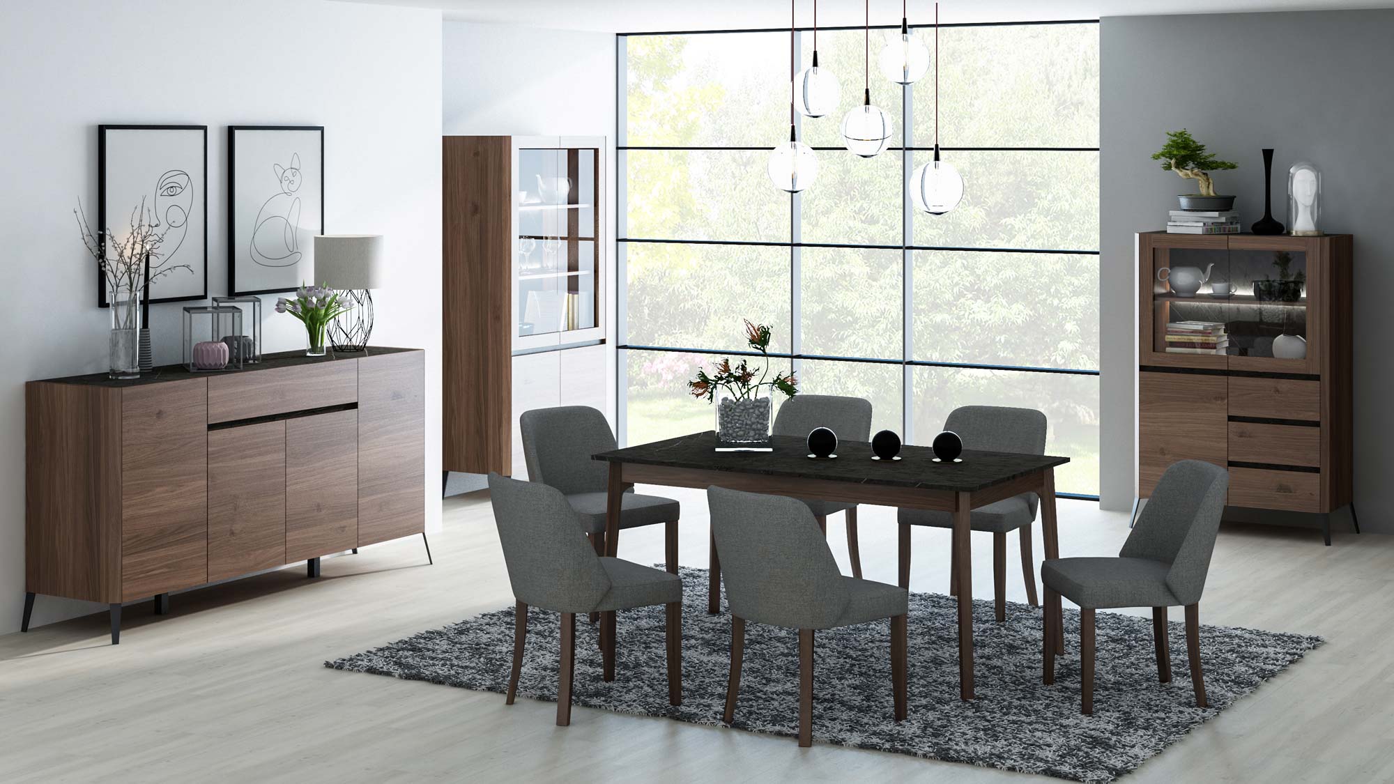 Projektanci kolekcji Lumeria stworzyli mebel, który zachwyca swoją prostotą, a jednocześnie zaskakuje bogactwem szczegółów. Witryna duża Lumeria wyróżnia się minimalistyczną bryłą, którą przełamują ciepłe akcenty naturalnych oklein w kolorze orzecha baltimore. Geometryczne linie dodają całości nowoczesnego charakteru, a blat z szarego kamienia sprawia, że mebel nabiera luksusowego wyrazu.