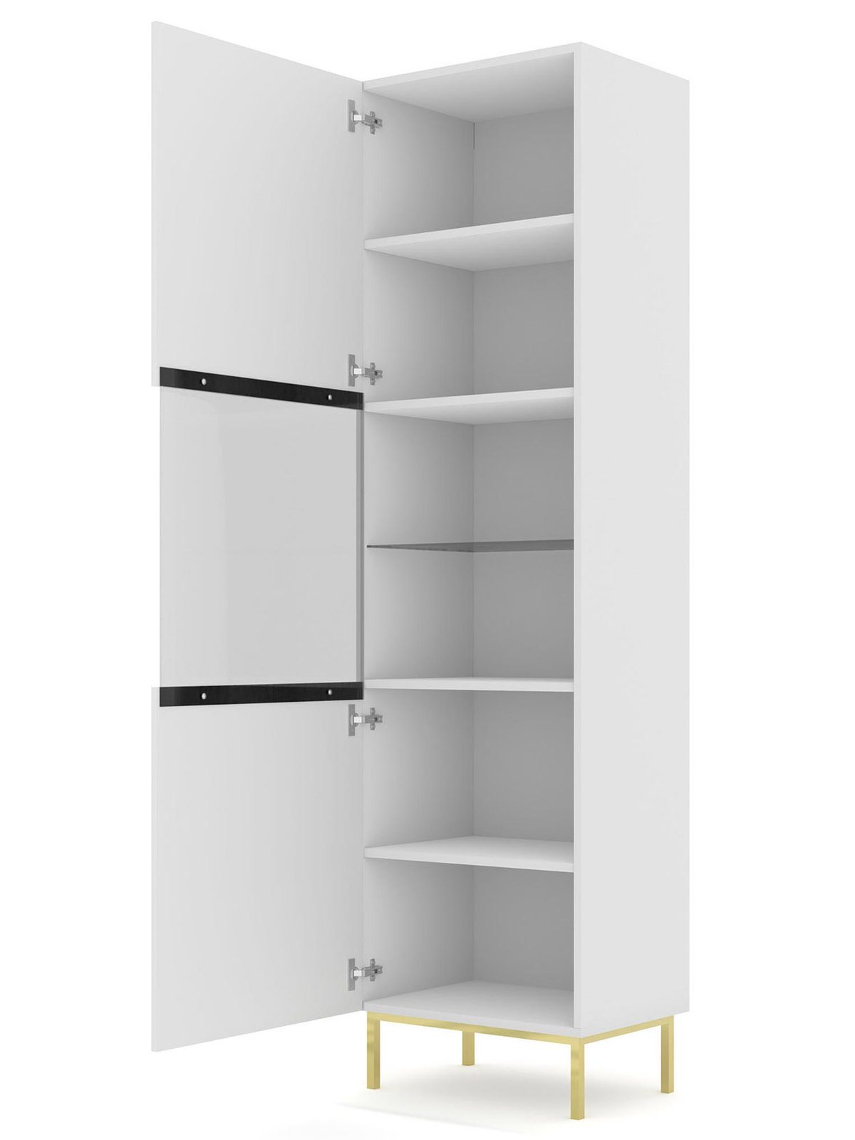 Witryna Navia z Frontami w Wysokim Połysku to mebel, który wprowadzi do Twojego wnętrza nowoczesność i elegancję. Biały matowy korpus i fronty w wysokim połysku dodają wnętrzu świeżości i wyrafinowania, a złote nóżki nadają mu luksusowego charakteru. Dzięki temu witryna Navia będzie doskonałym uzupełnieniem zarówno minimalistycznych, jak i bardziej klasycznych aranżacji, wnosząc do nich odrobinę nowoczesnego stylu. Dodatkowo, Każdy element Witryny Navia z Frontami w Wysokim Połysku został zaprojektowany z myślą o funkcjonalności. Półki zapewniają dużo miejsca do przechowywania, co pozwala na utrzymanie porządku i organizacji w Twoim wnętrzu.