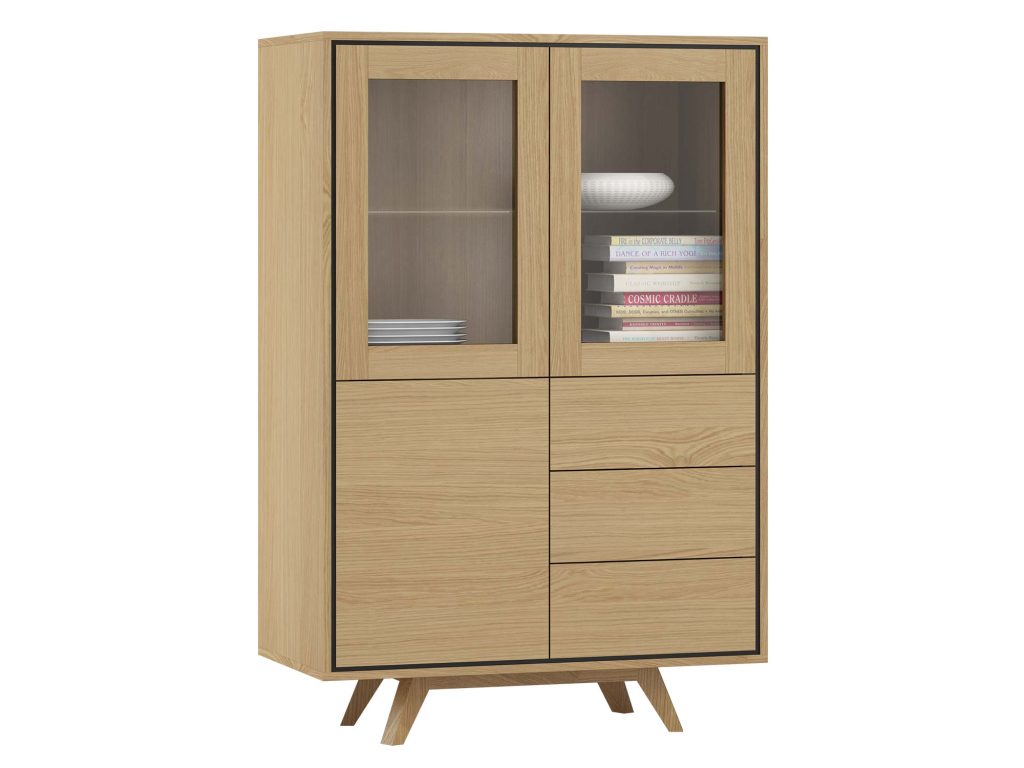 Podstawę witryny stanowią skośne nogi wykonane z litego drewna dębowego, które nadają lekkości, a zarazem gwarantują stabilność. Dzięki wysokości 150 cm witryna świetnie wpisuje się w przestrzenie, w których nie można zastosować wysokich, dominujących mebli, ale wciąż zależy nam na eleganckim i funkcjonalnym rozwiązaniu do przechowywania.