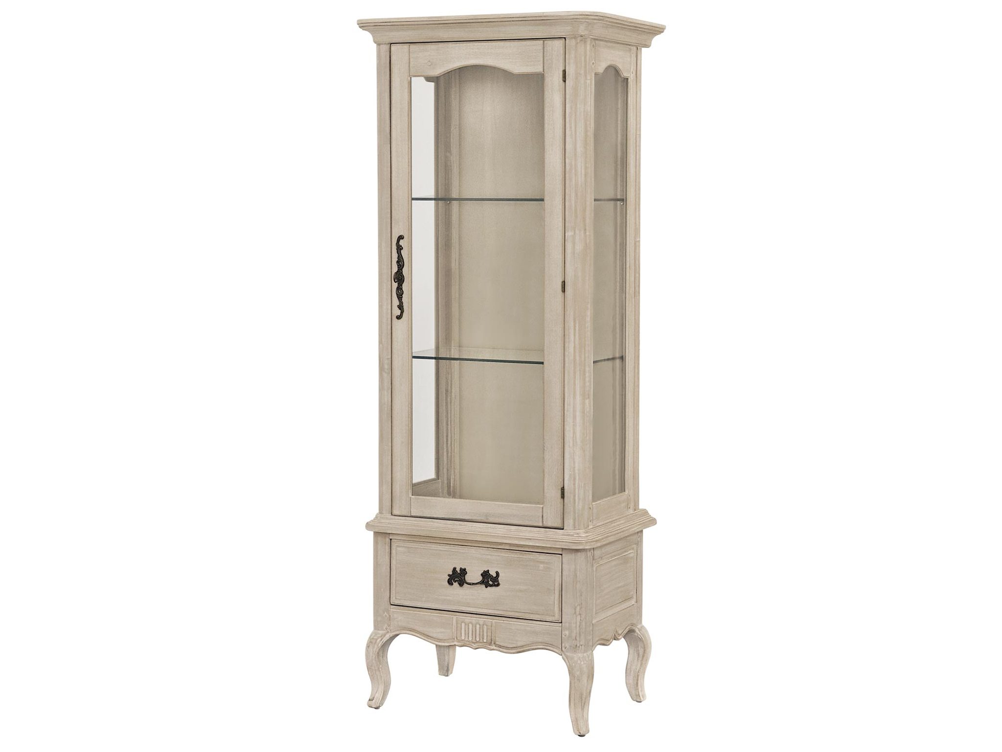 Witryna drewniana na giętych, frezowanych nogach jest w stylu prowansalskim. Korpus jest w niejednolitym jasnobeżowym półmacie. Witryna posiada metalowe uchwyty w kolorze ciemnego mosiądzu oraz frezowania.