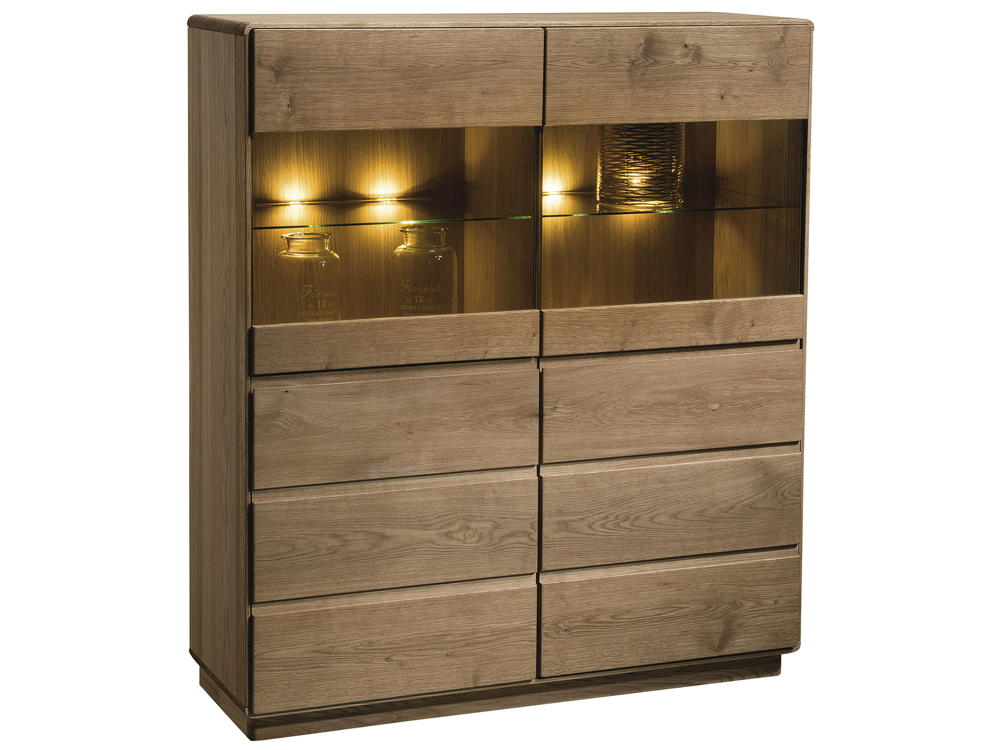 Gustowna i nowomodna witryna do jadalni wykonana z najwyższej jakości litego drewna dębowego z elementami fornirowanymi świetnie dostosuje się do każdej aranżacji każdej kuchni i jadalni. Mocna konstrukcja kolekcji Seto oraz nowomodne, stylowe szlifowanie sprawią, że mebel świetnie udekoruje niejedną jadalnię. Witryna szklana do salonu posiada bardzo praktyczne drzwi szklane na górze, gdzie świetnie prezentują się szkła i kryształy oraz drewniane drzwi na dole, za którymi znajduje się dogodna przestrzeń do przechowywania sztućców, zastawy i innych stołowych akcesoriów.