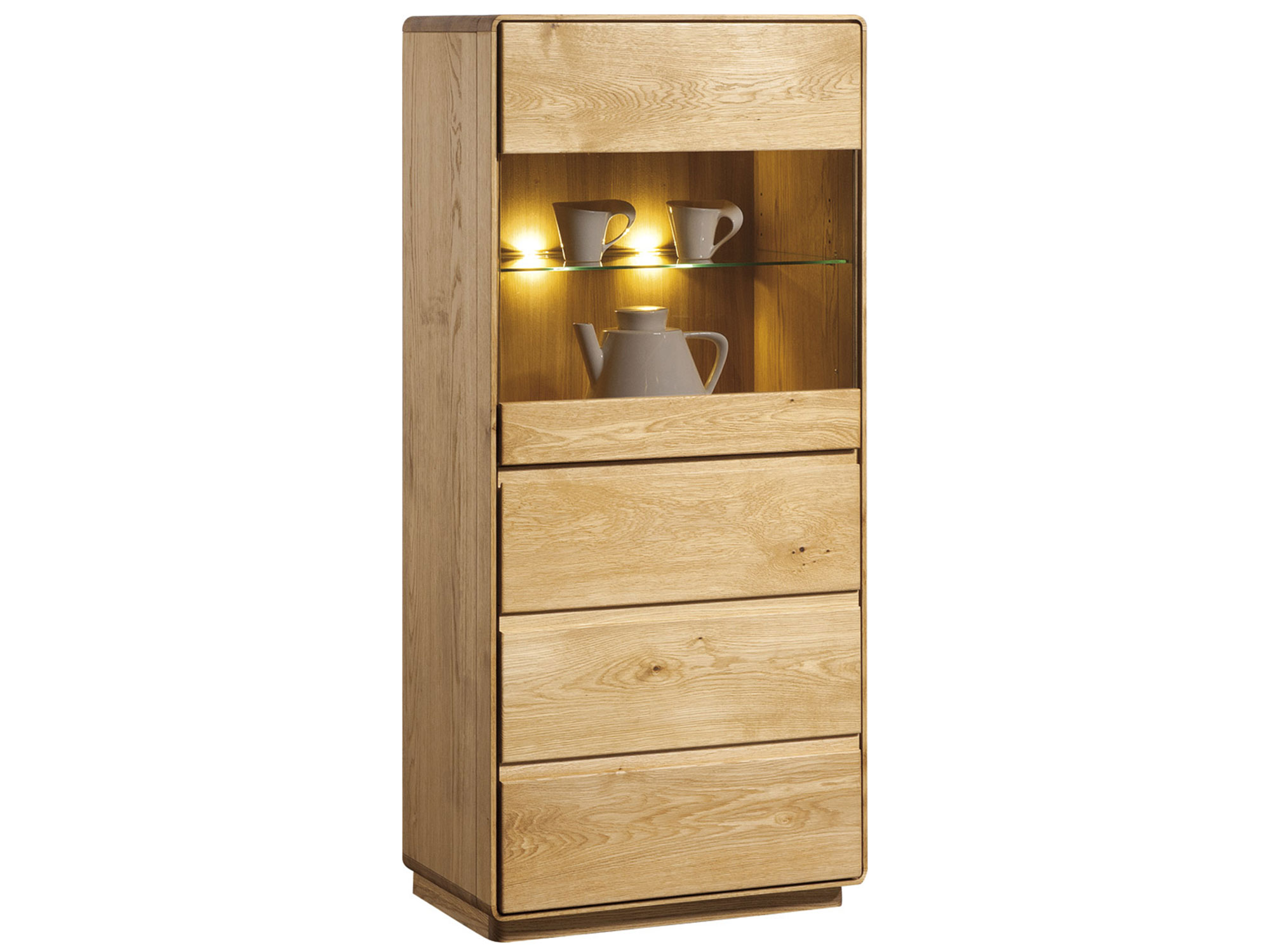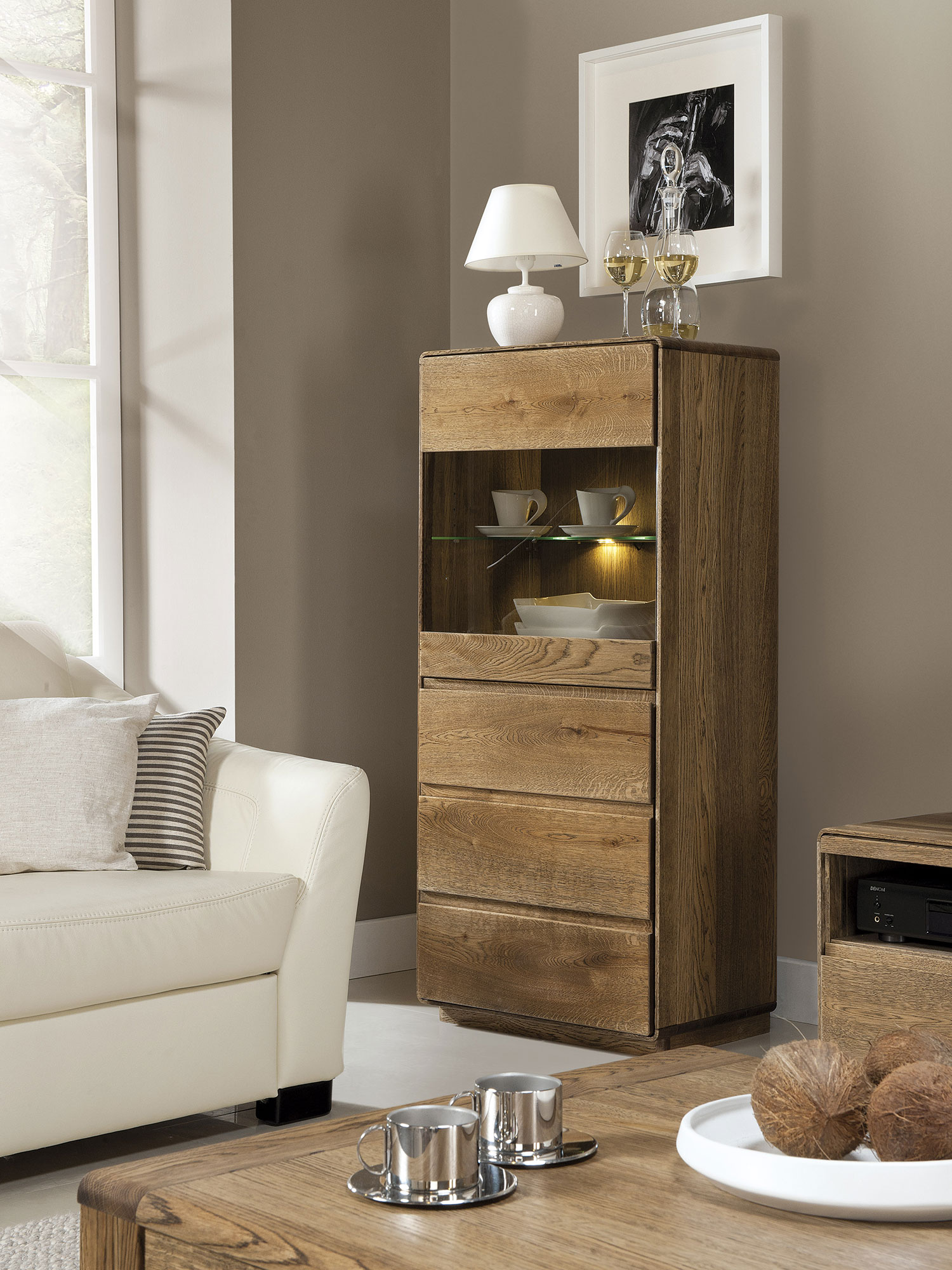 Stylowa i nowoczesna drewniana witryna ze szkłem zrobiona z litego drewna dębowego najlepszego gatunku z fornirowanymi detalami świetnie dostosuje się do każdej aranżacji niejednej jadalni czy salonu. Co więcej stateczna struktura oraz nowomodne, stylowe szlifowanie sprawią, że witryna z barkiem świetnie udekoruje każde pomieszczenie. Ponadto mebel ma funkcjonalne drewniane drzwiczki idealne do pełnienia funkcji barku oraz przeszkloną cześć, która znakomicie wyeksponuje szkło, kryształy lub pamiątki i rodzinne zdjęcia.
