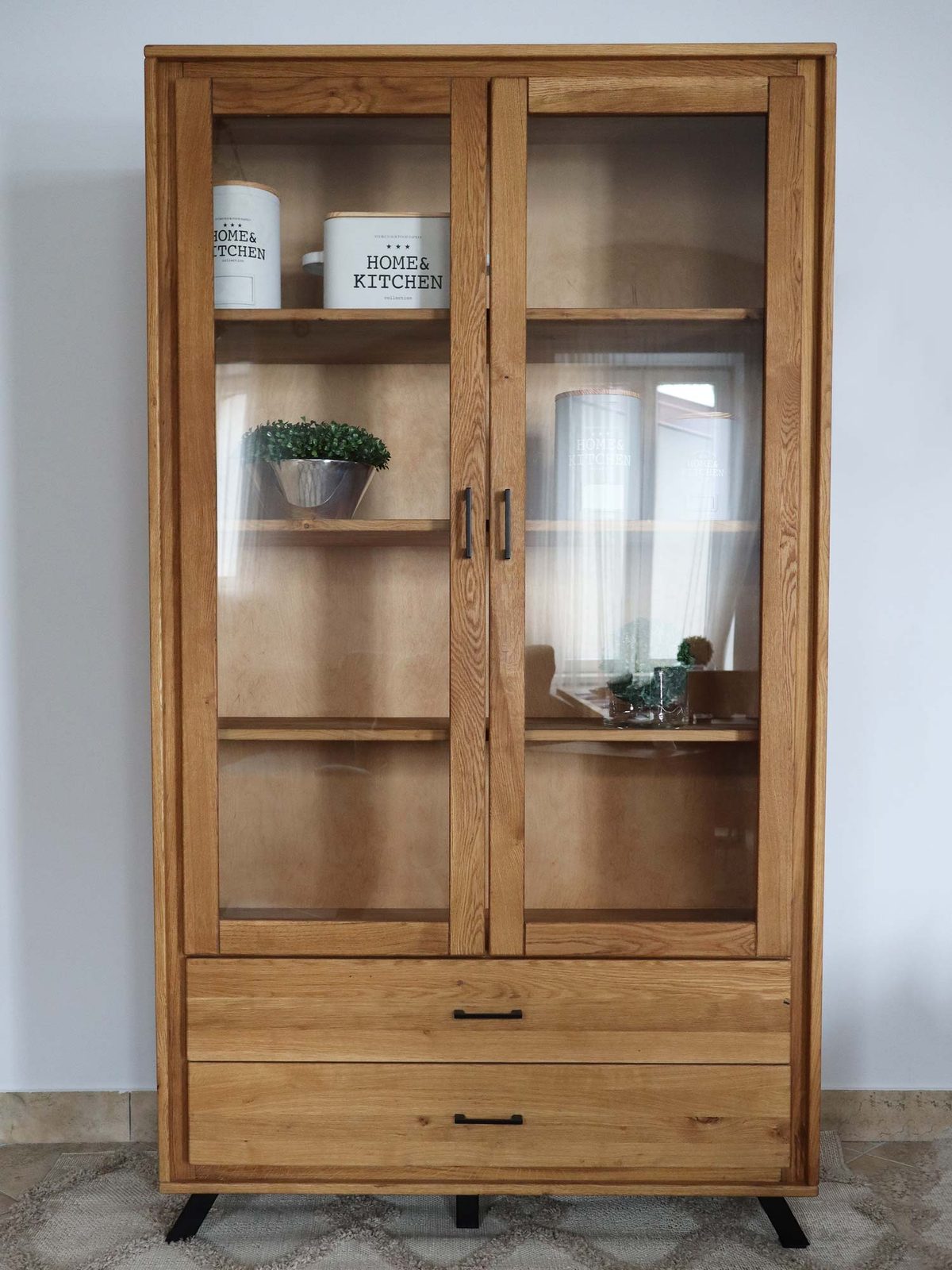 Oferowana wysoka witryna dębowa na nóżkach ALAMOS LOFT pozwoli stworzyć niepowtarzalne wnętrze jadalni lub salonu w nowoczesnym stylu. Dodatkowo prosty i uniwersalny, a jednocześnie elegancki i ponadczasowy design sprawi, że witryna z dębu zapewni mnóstwo przestrzeni użytkowej w doskonałym stylu. Co więcej komoda podzielona jest na 2 części, z których każda zapewni maksymalną część użytkową. Mebel ten posiada parę przeszklonych drzwiczek oraz 2 dolne szerokie i pojemne szuflady, dzięki czemu zapewni dużo miejsca do przechowywania. Cała konstrukcja oparta jest na stabilnych i wytrzymałych 10 centymetrowych metalowych nóżkach w kolorze czarny mat, które dodają meblowi industrialnego charakteru. Ponadto dębowe meble do salonu to kwintesencja elegancji, stylu oraz wytrzymałości. A wszystko to dzięki specjalnej, bardzo skrupulatnej selekcji i obróbce drewna. Piękna, funkcjonalna witryna z połączeniem czerni i naturalnego drewna z widocznymi przebiciami, usłojeniem i strukturą tworzy harmonijne zestawienie, które doskonale sprawdzi się w wielu aranżacjach.