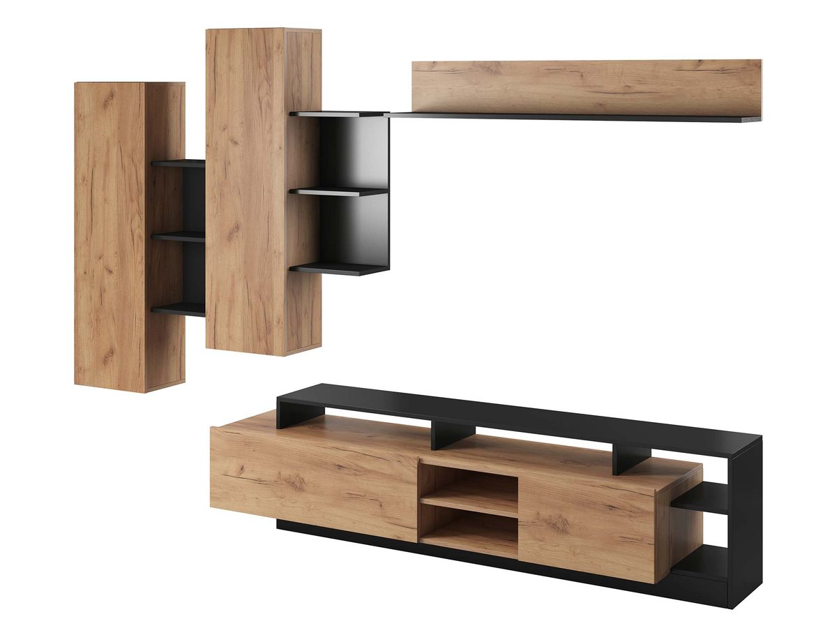 Demonstrowana obok meblościanka z półką AURORA to wyjątkowa seria, która nada każdej aranżacji gustownego stylu i dobrego smaku. Wysokiej klasy materiały użyto do wykonania kompletu, którymi są laminowane płyty meblowe. Modna meblościanka do pokoju została zrobiona z materiałów, które ponadto oklejono obrzeżem ABS, które ma za zadanie ochraniać je od zniszczeń i uszkodzeń mechanicznych oraz wzmacniać trwałość, zabezpieczać przed wilgocią, a do tego jest ono odporne na ścieranie. Ponadto opcjonalne oświetlenie LED w meblach to niezwykle modny trend ostatnich lat, który zachwyca i fascynuje amatorów nowoczesnego stylu. Dzięki temu oświetlenie elegancko akcentuje atuty meblościanki oraz fantastycznie sprawdza się jako zamiennik świec i lamp. Taki dodatek daje szczególny efekty, a przy tym uzupełnia meble w tajemniczy powab i kontrastowość jednocześnie obłędnie wygląda nocą.