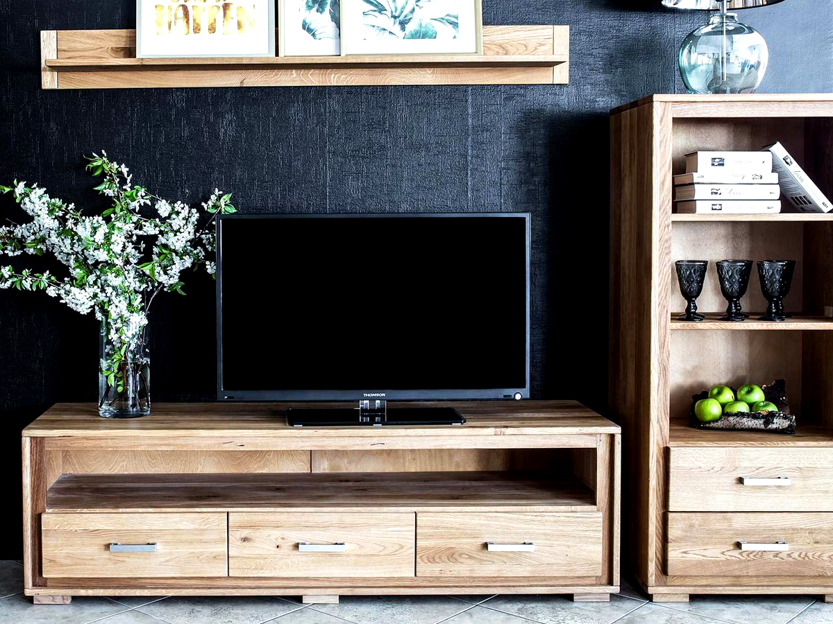 - Co najważniejsze pamiętaj o tym by dobrać drewnianą szafkę rtv pod rozmiar salonu oraz telewizora. Przede wszystkim wymiar szafki powinien być proporcjonalny do rozmiaru wnętrza salonu. Ponadto w małych pomieszczeniach warto zdecydować się na szafkę o jasne kolorystyce , która nie przytłoczy pomieszczenia. Przy wyborze mebla trzeba mieć też na uwadze, że umieszczenie dużego telewizora na zbyt pokaźnej szafce optycznie zmniejszy wnętrze i zaburzy jego harmonię. Zaś mały ekran „zgubi się”, jeśli ustawisz go na dużej szafce RTV oraz odwrotnie – pokaźny telewizor nie będzie dobrze wyglądać ustawiony na małej szafce.