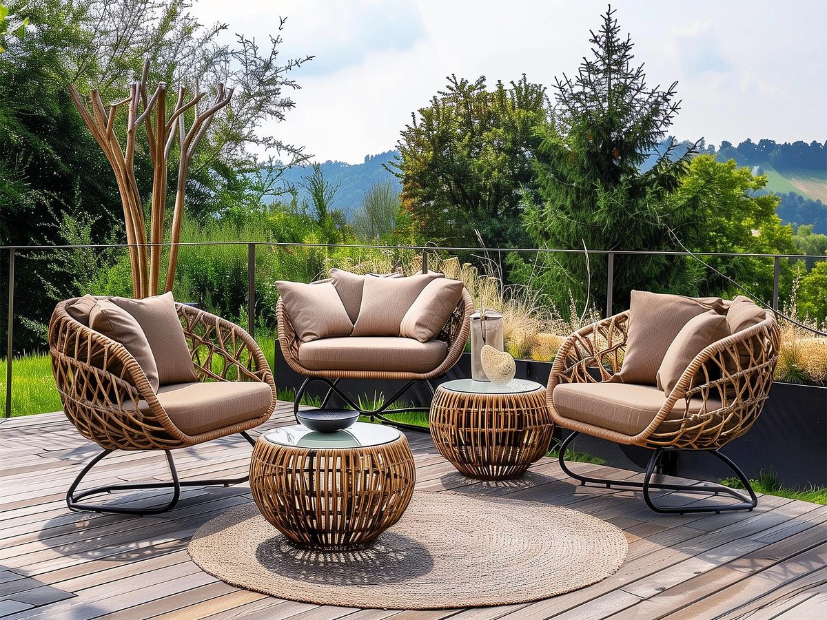 - Meble ogrodowe z rattanu: Wykonane z elastycznych, ale wytrzymałych włókien, oferują klasyczny, pleciony wygląd. Naturalny rattan najlepiej sprawdza się w zacisznych, osłoniętych miejscach, ponieważ długotrwała ekspozycja na słońce i deszcz może powodować jego uszkodzenie.